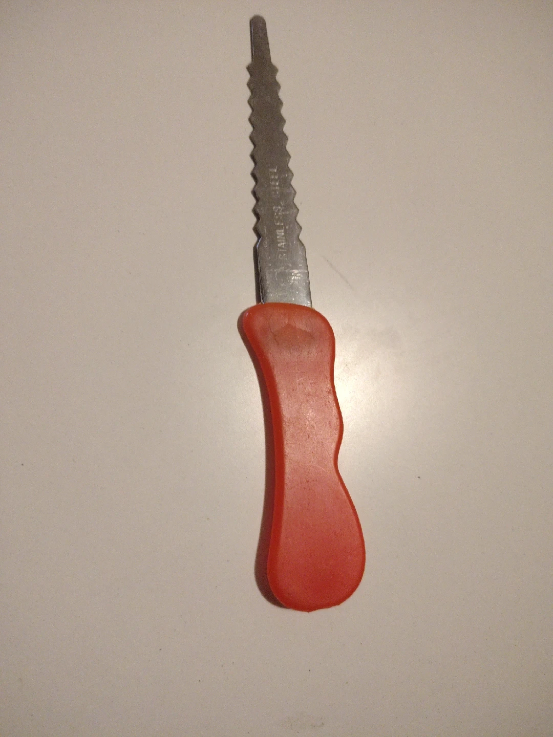 91Selling a serrated pumpkin carving knife with an orange plastic handle. The blade is stainless steel. It's in good condition and ready for a new home
