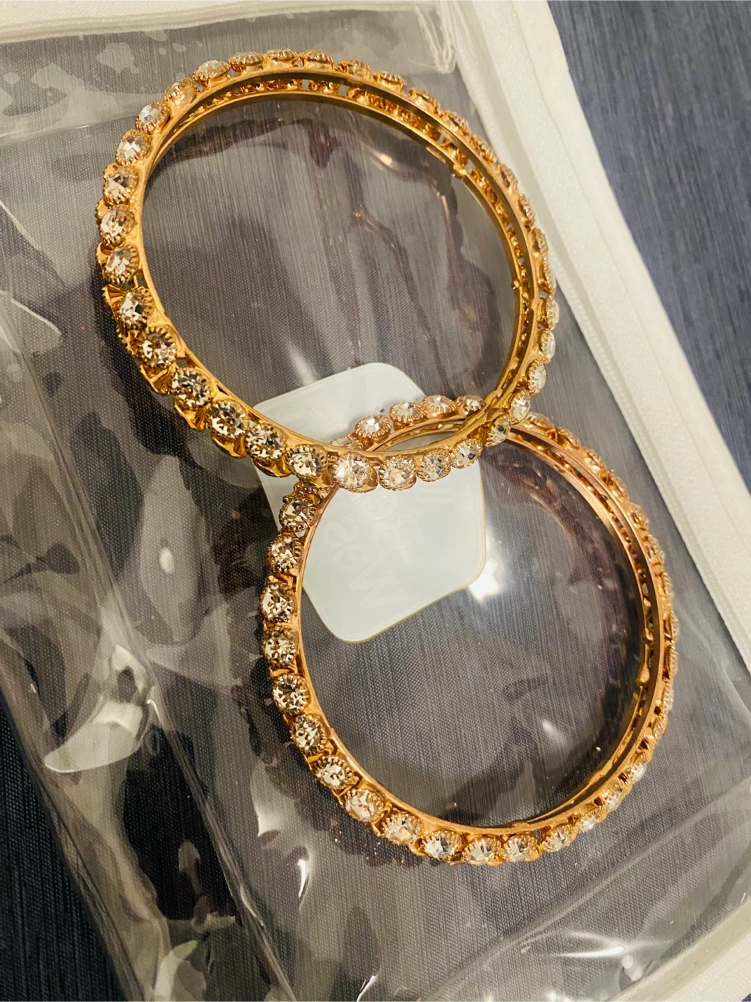 Selling a set of two gold-tone bangles, (once worn) each adorned with sparkling rhinestones. They're in great condition and measure approximately 2.5 inches in diameter. A lovely addition to any jewellery collection!