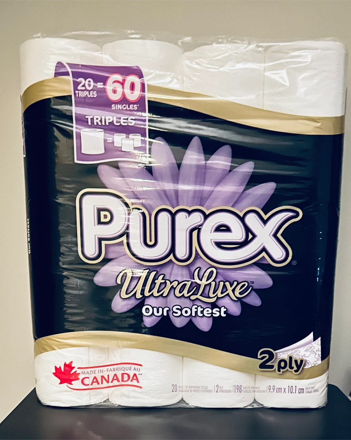 Purex UltraLuxe toilet paper. Each roll is 2-ply and made in Canada. 20 rolls, which is equivalent to 60 single rolls. New and Sealed Package Pick up only