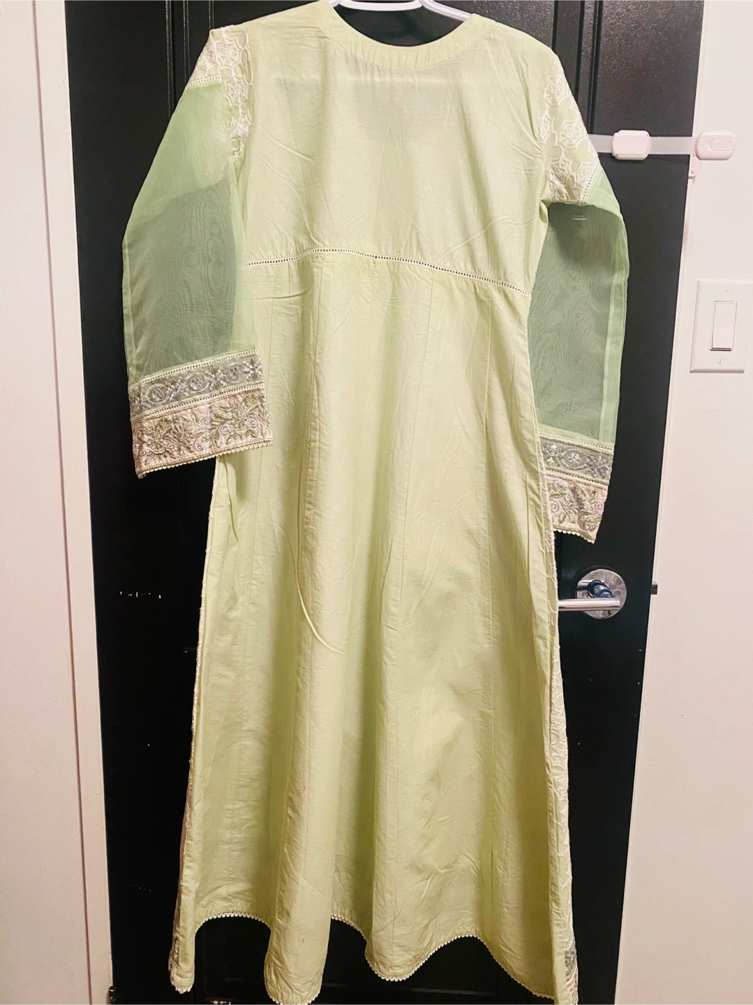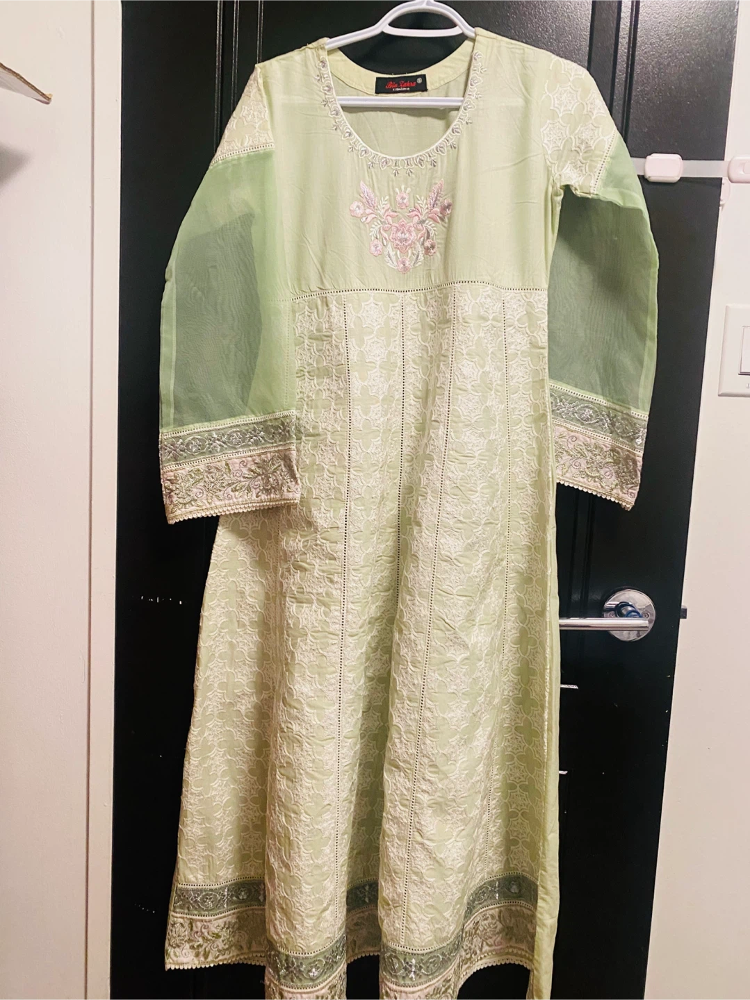 Beautiful light green Bin Zehra (gently used once) dress with intricate embroidery. The dress features delicate floral patterns and sheer sleeves, perfect for a special occasion or a stylish everyday look. Excellent condition and ready for a new home!