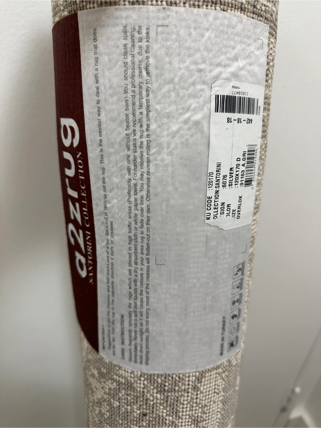 Selling a rug from the A2Z Rug Santorini Collection. It's silver in colour and measures 120x170cm. Perfect for adding a touch of elegance to any room!