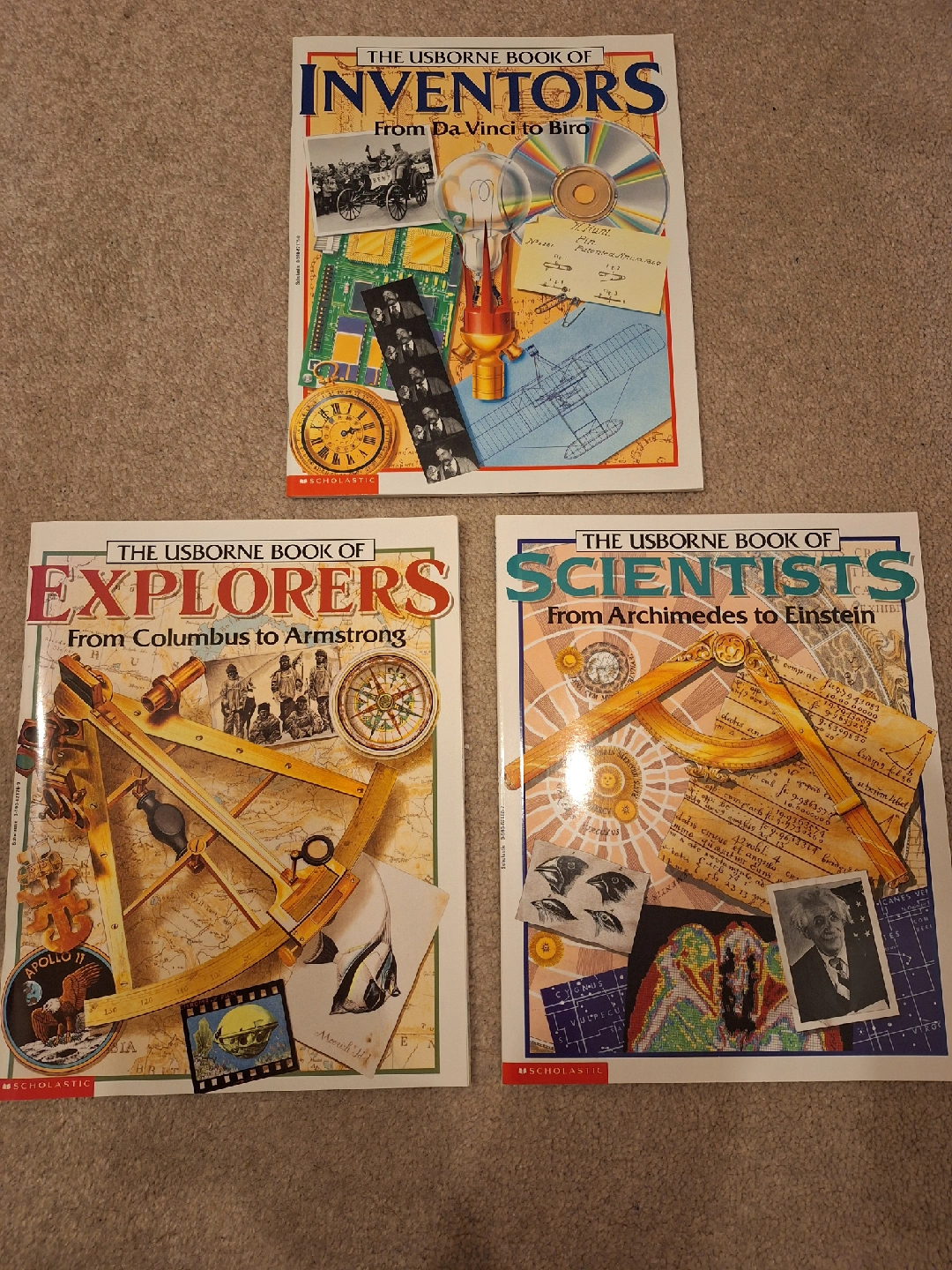 Selling a set of three Usborne books: The Usborne Book of Inventors (From Da Vinci to Bird), The Usborne Book of Explorers (From Columbus to Armstrong), and The Usborne Book of Scientists (From Archimedes to Einstein)