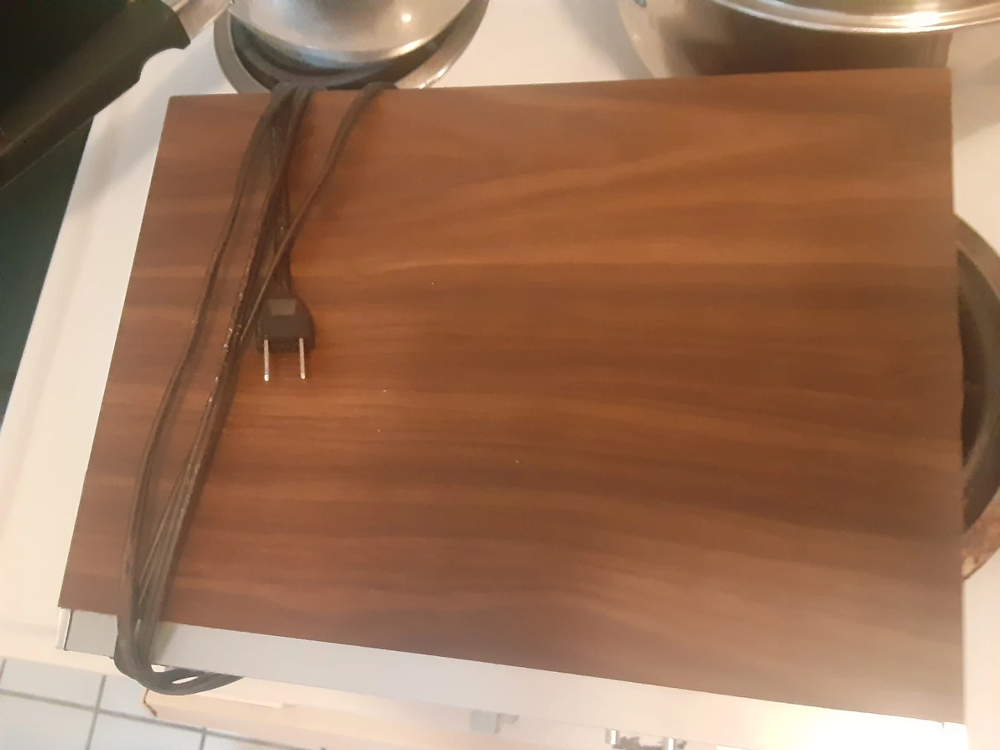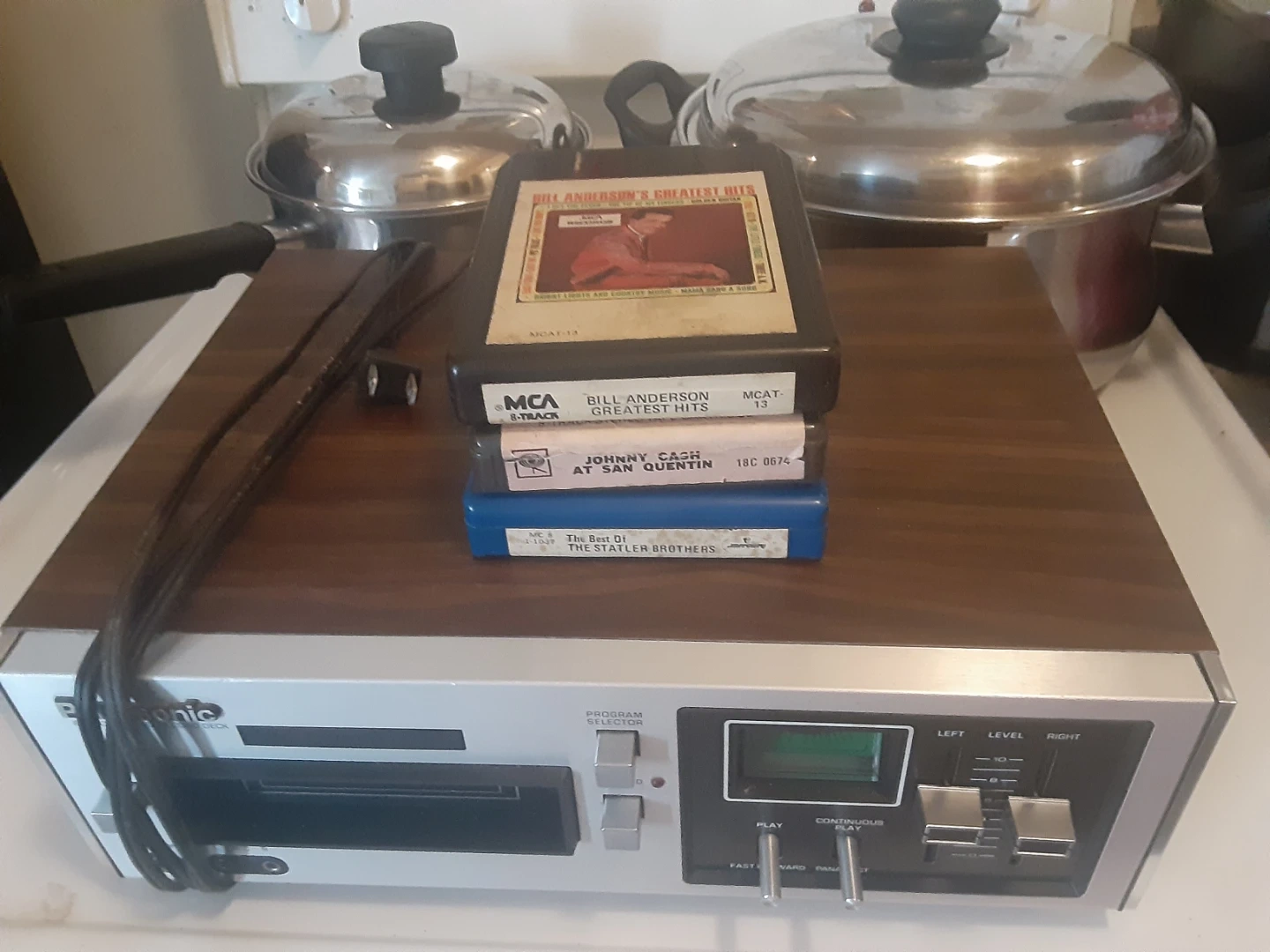 8 Track player with a woodgrain finish. It comes with multiple 8-track tapes including Bill Anderson, Johnny Cash, and The Statler Brothers. Made in Japan.