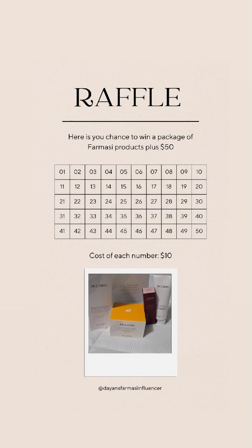 15Selling a chance to win a package of Farmasi products plus $50 through a raffle! Each number costs $10. Don't miss out on the opportunity to win some great Farmasi products