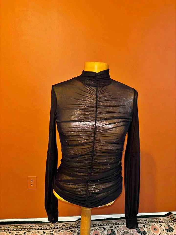 Stylish and elegant GUESS Los Angeles top featuring a ruched front, long sleeves, and metallic shimmer fabric. The sheer mesh design gives it a bold, trendy look β perfect for night outs, parties, or layering under a blazer.