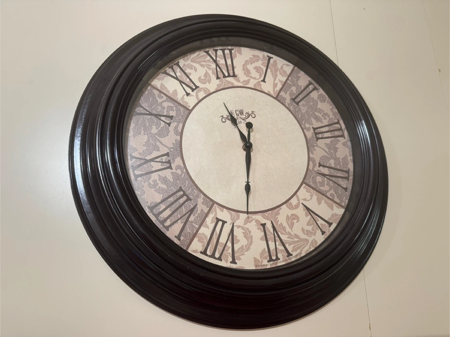 10Selling a lovely ECW wall clock with Roman numerals! It has a classic design that would look great in any home. The clock face features a decorative pattern, and the frame is a dark colour. It's in great condition and ready to be hung up
