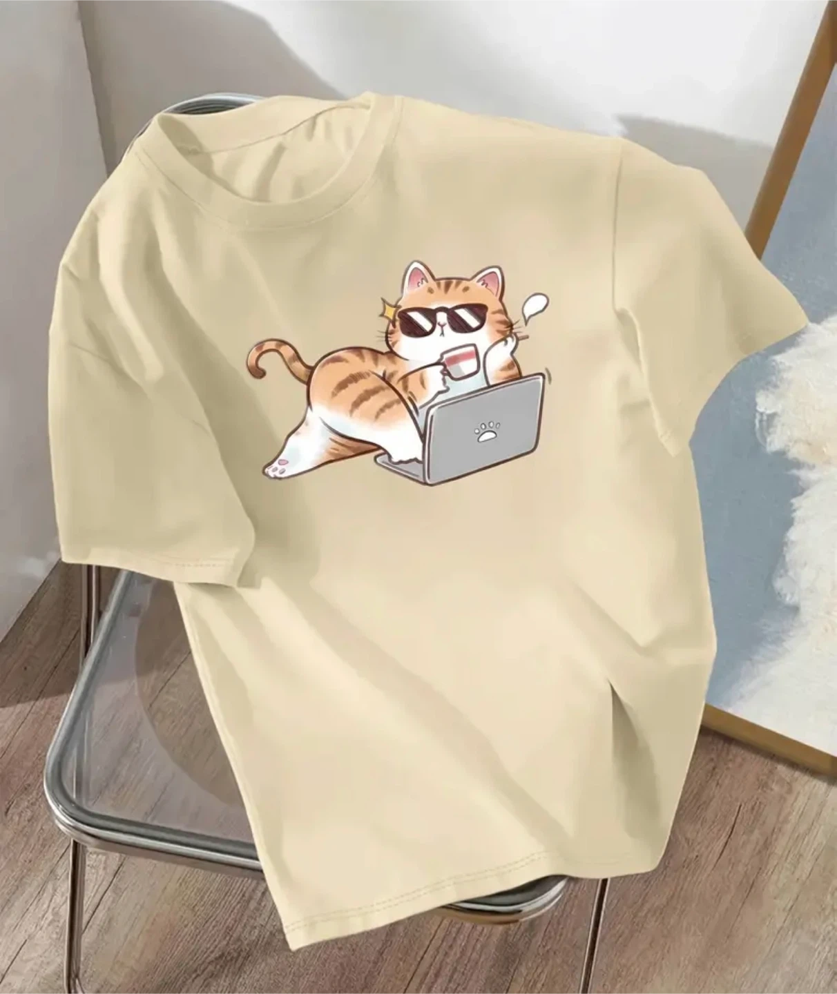 10Selling a cute beige t-shirt featuring a cool cat design! The cat is wearing sunglasses and relaxing with a drink while using a laptop. It's a fun and unique piece to add to your wardrobe