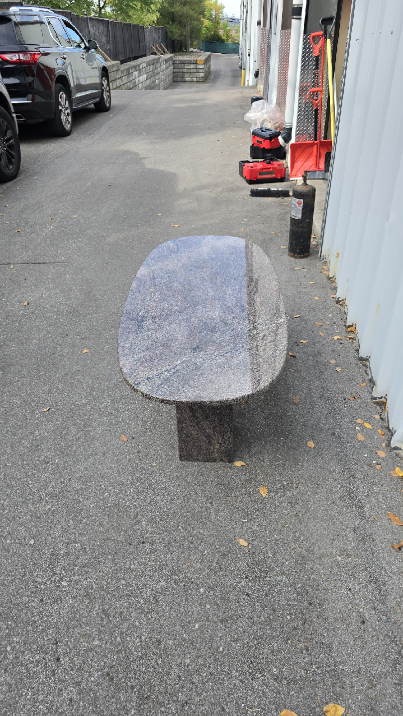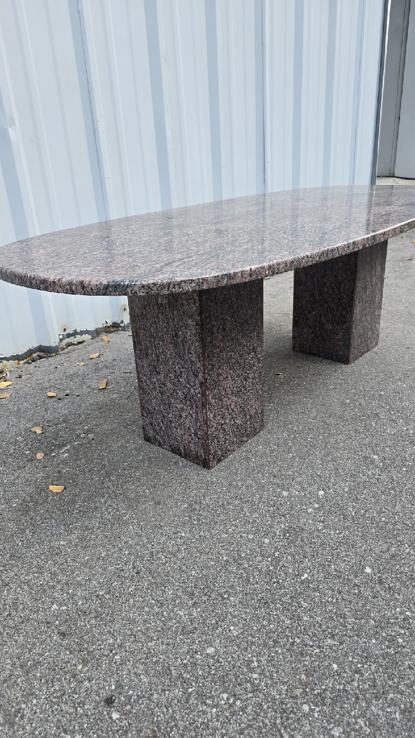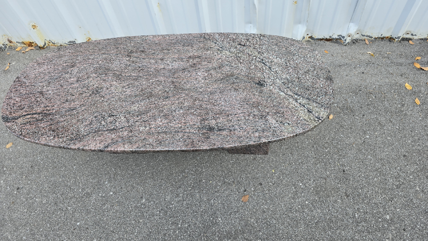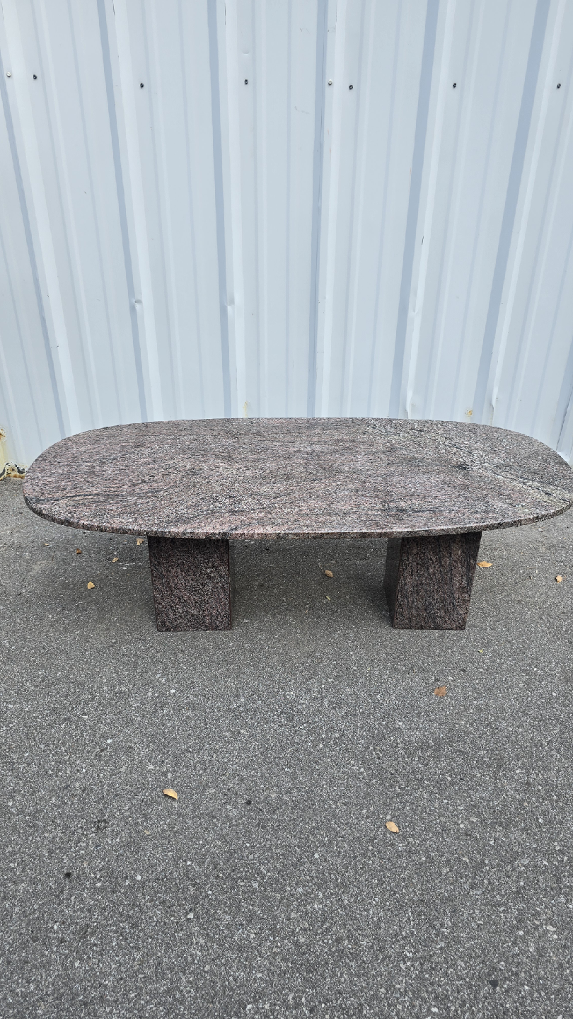 Selling a granite coffee table. It has an oval top and a unique speckled pattern. It's in good condition and would be a great addition to any living room!