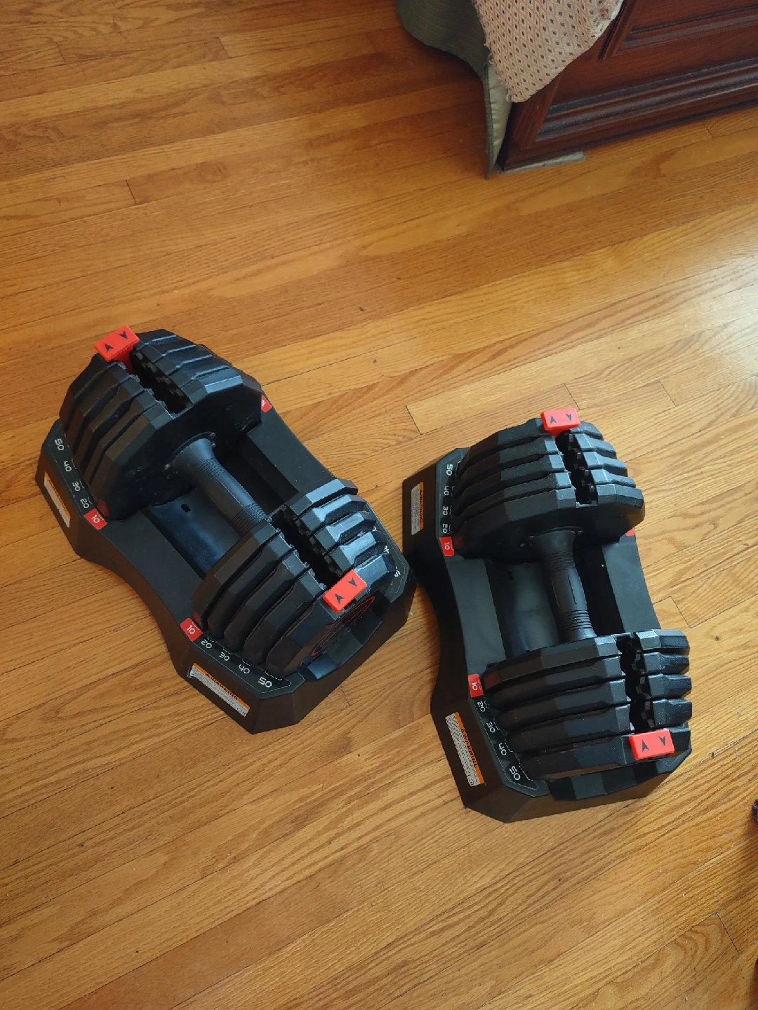 Selling a Weider adjustable dumbbell set in great condition! These dumbbells are perfect for home workouts and allow you to easily adjust the weight to suit your fitness level. Each dumbbell can be adjusted from 10 to 50 lbs, making them versatile for various exercises