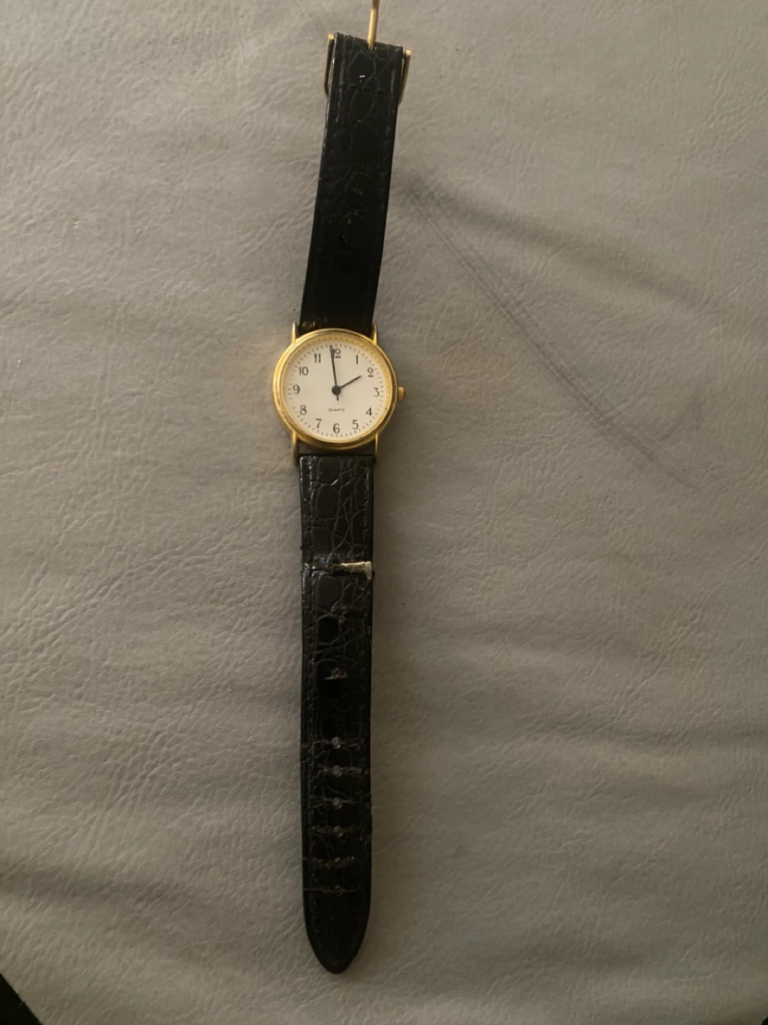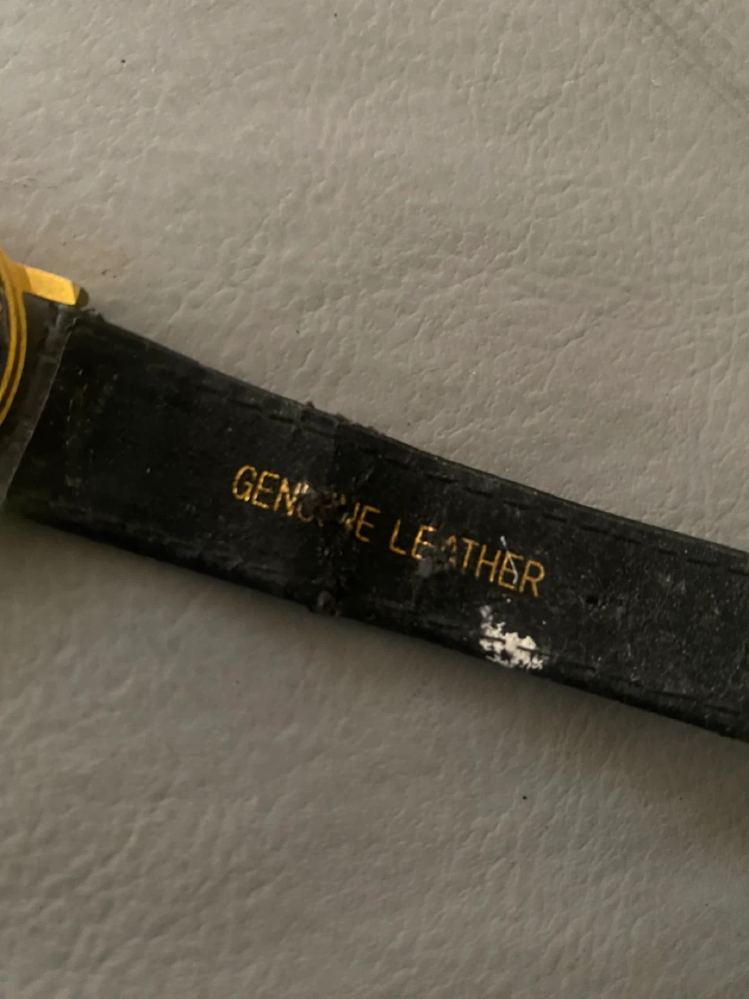 Selling a ladies' gold-tone watch with a black genuine leather band. The band shows some wear, as pictured. no idea if working
