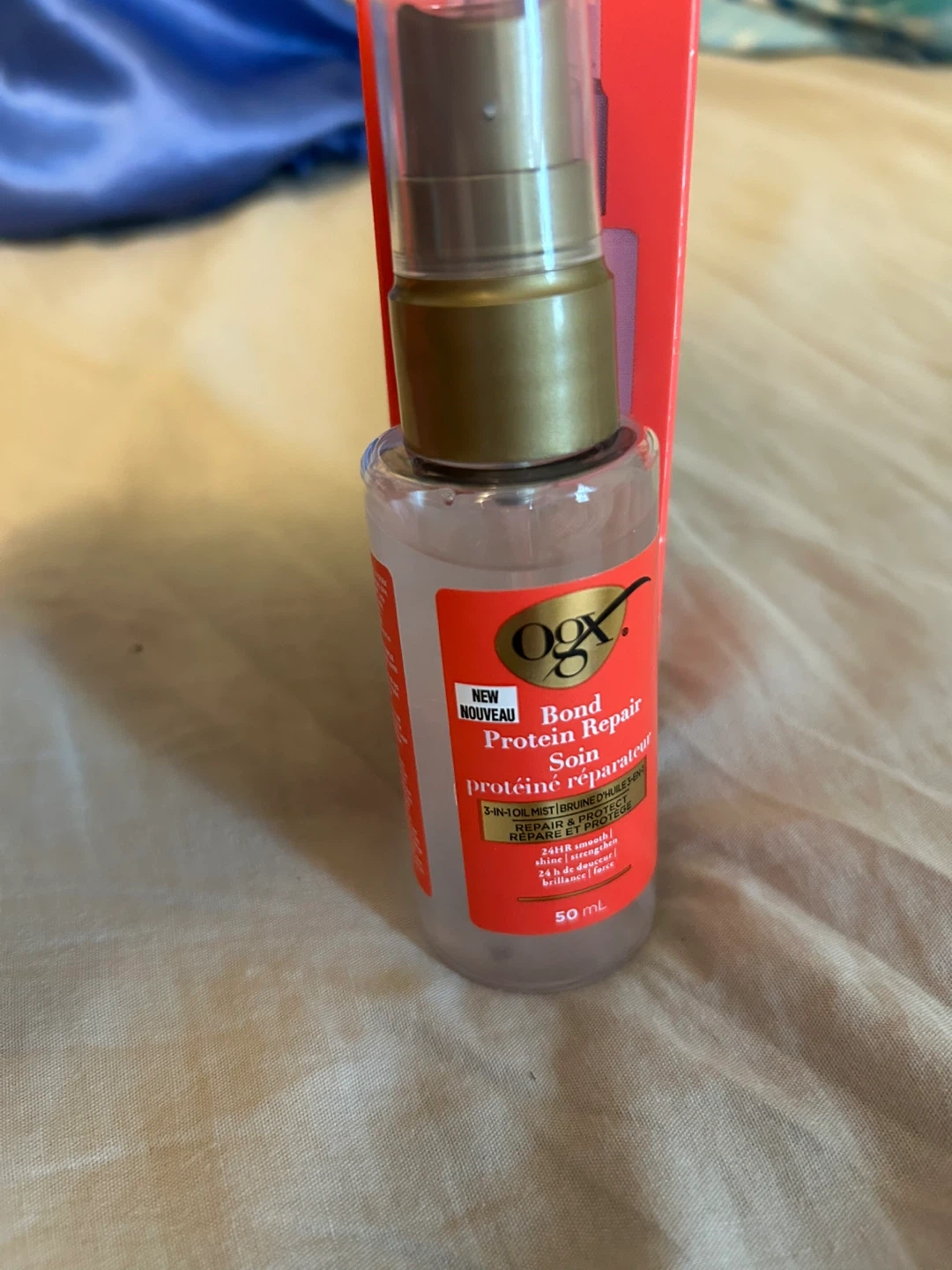 Selling a bottle of OGX Bond Protein Repair 3-in-1 Oil Mist! It's a 50mL bottle designed to repair, protect, and provide a smooth, shiny finish. This oil mist is perfect for strengthening your hair and giving it a healthy glow
