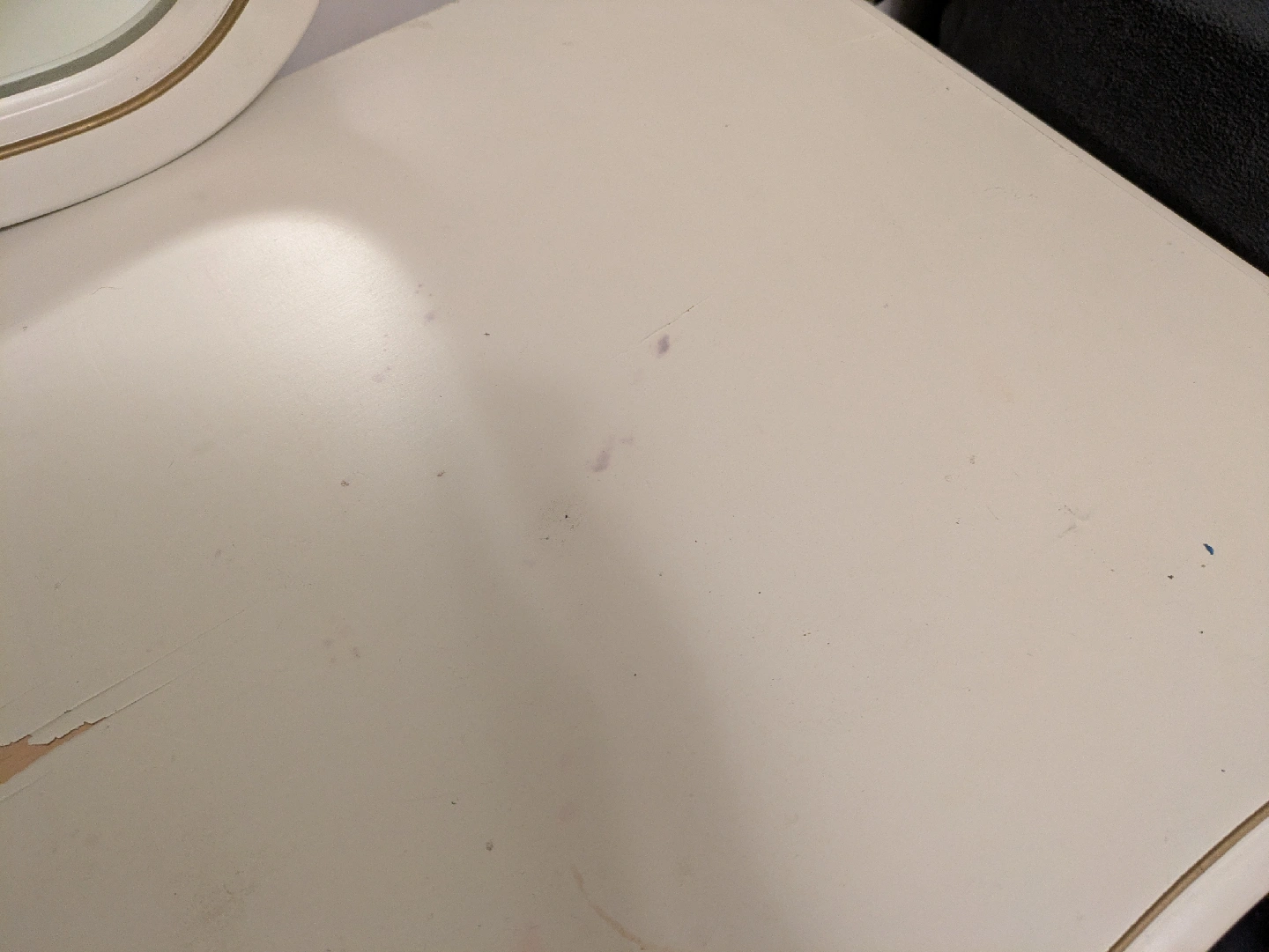 Selling a white Victorian style dresser with Gold inlay and a mirror. It has nine drawers and ornate handles. There are some signs of wear and tear, as shown in the photos, but it's still a functional, sturdy, solid wood piece of furniture.