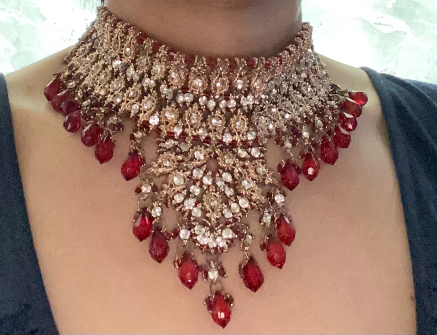 Beautiful statement necklace with red and gold accents! It's in great condition and would be perfect for a special occasion or to add some flair to your outfit
