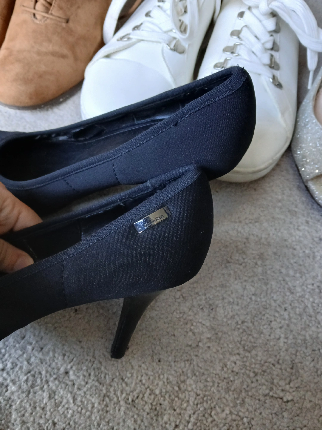 Calvin Klein black heels size 6.5. Nice stretchy material so it's more comfortable. Mostly a tiny bit of wear on the side of the inside that's not noticeable when worn