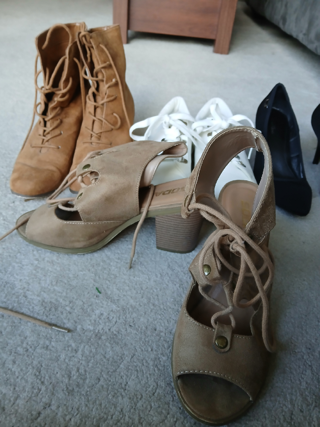 Soda tan coloured heeled sandals with tied shoe laces size 8. Has some scratches but lots of life left.