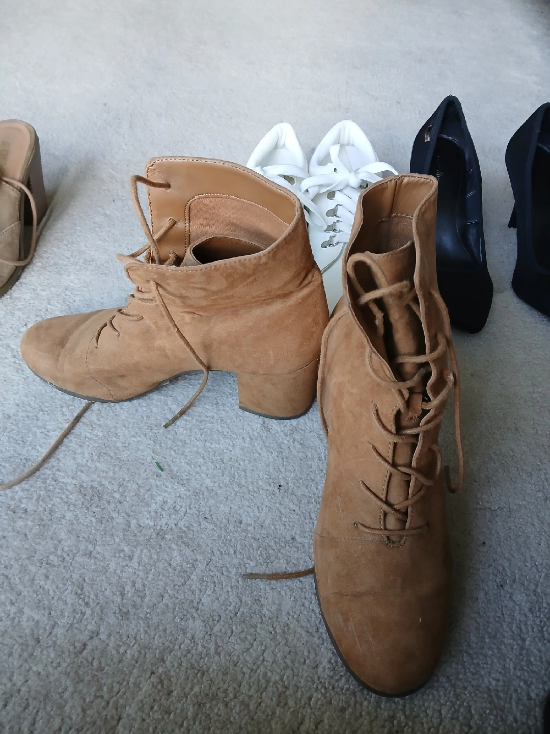 Soda tan coloured heeled sandals with tied shoe laces size 8. Has some scratches but lots of life left.