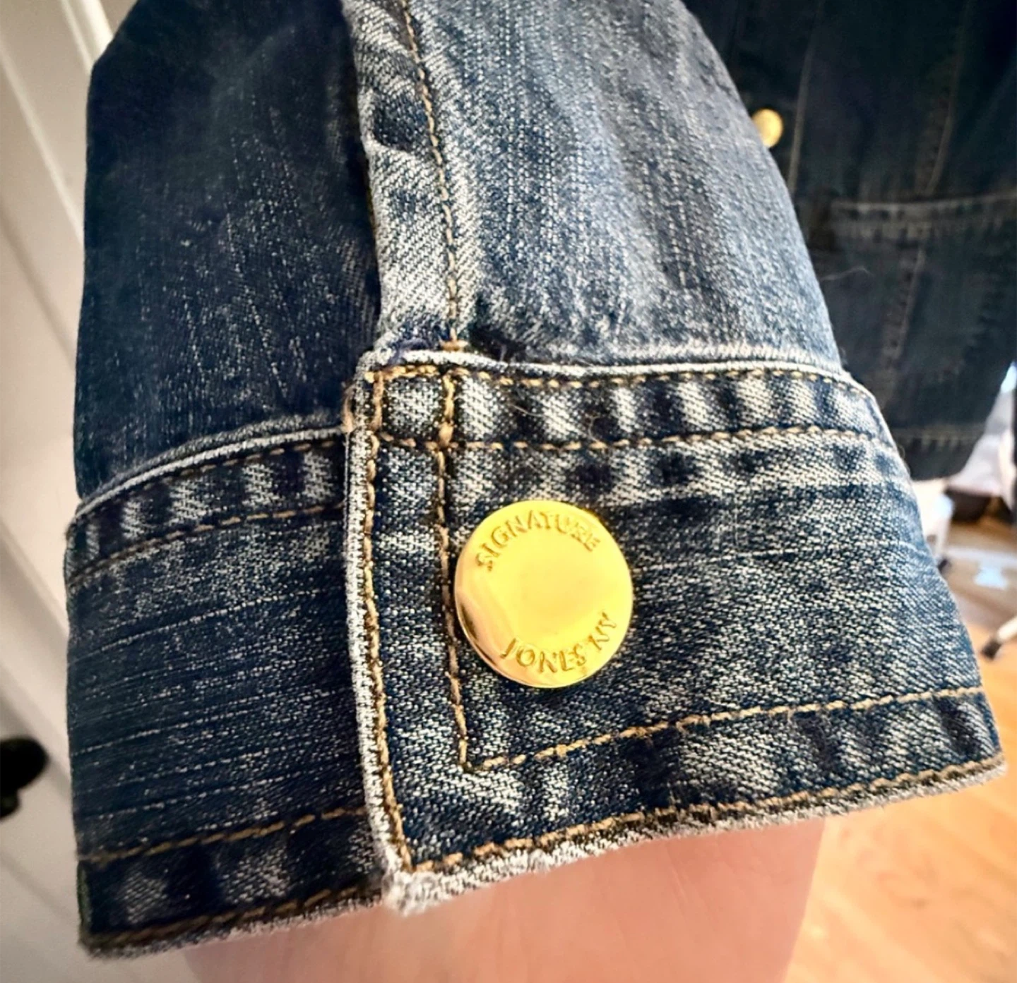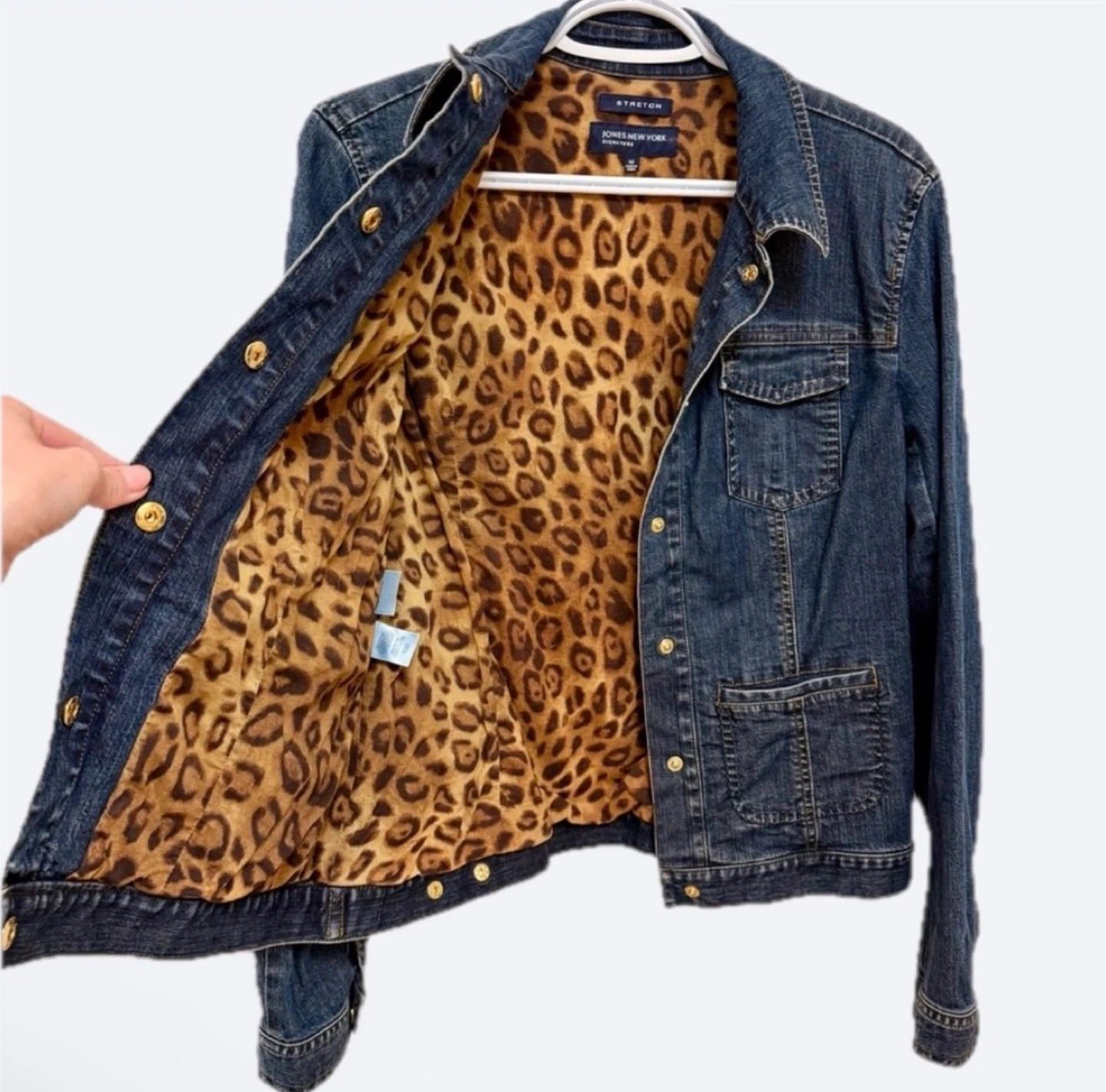 Size medium blue denim jacket with animal print interior lining. Part of the Jones New York STRETCH collection so it has stretch to the fabric. Such an amazing jacket, but it’s time to part with it. Snap closure buttons make everything so much easier. They are gold. Love the interior. Literally no flaws or damages. Pockets are also there! Looks great buttoned up or left undone. The material is not stiff, super comfortable. Also gives you options to button or unbutton areas like the wrist and the back for less or more room.