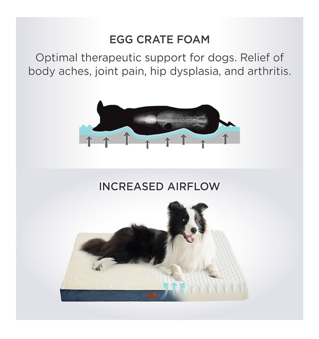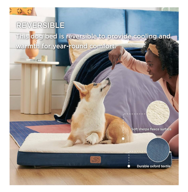 This is a brand-new dog bed designed for ultimate comfort and support. It features a reversible design with super-soft fleece on one side for winter warmth and durable oxford textile on the other for summer coolness. The egg crate foam provides therapeutic support, relieving body aches and joint pain. It also has a waterproof inner liner for easy cleaning. Your furry friend will love it! Features: * Reversible design for year-round comfort * Super-soft fleece for winter warmth * Durable oxford textile for summer coolness * Egg crate foam for therapeutic support * Waterproof inner liner If the ad is up, it's available! I am not quite sure what my dog thinks of it since he prefers my bed instead. Maybe your dog will appreciate it more. Cashless payment, Cash accepted