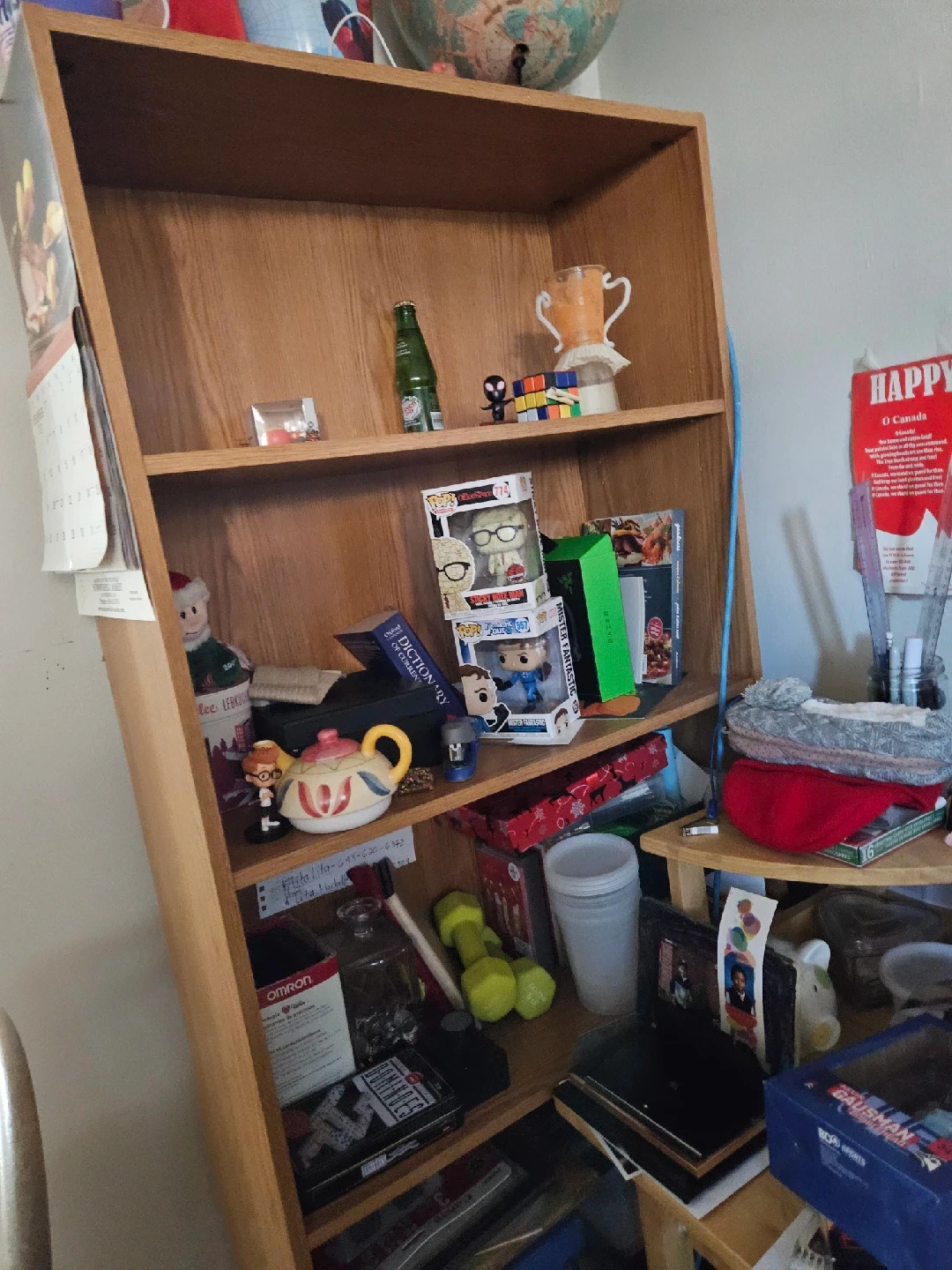Selling a wooden bookcase. It has a few shelves and is great for storing books or displaying items. It is in good condition.