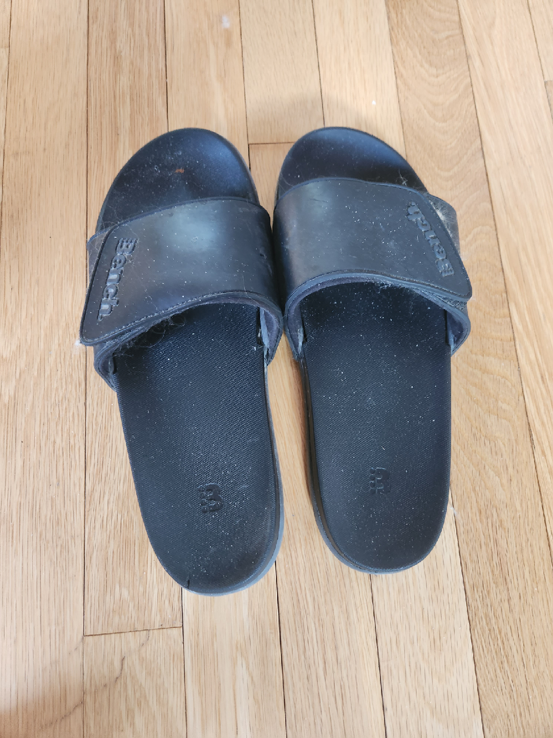 Bench slides in size 8. These slides are in good condition and come with the original box. They are black and have the Bench logo on the strap and sole