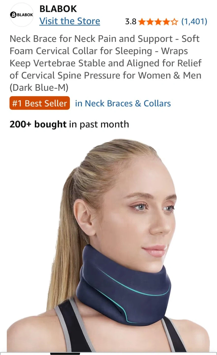 I'm selling a Blabok neck brace in dark blue, size M. It's designed for neck pain relief and support. It's a soft foam cervical collar that wraps to keep vertebrae stable and aligned, relieving cervical spine pressure for women and men