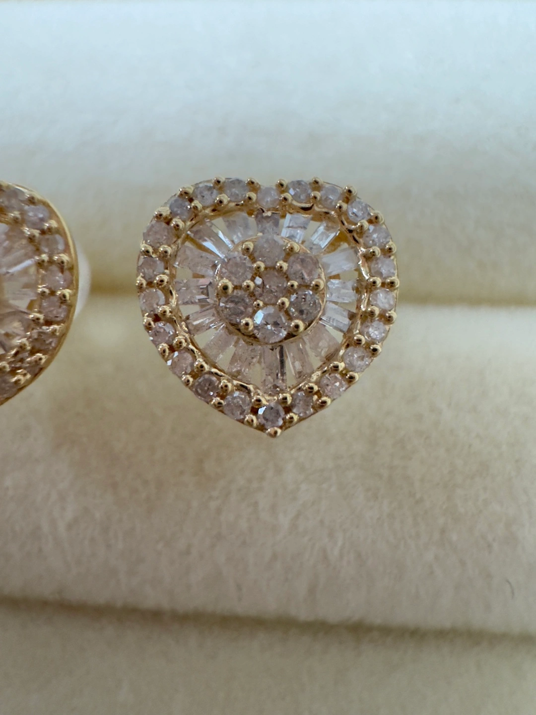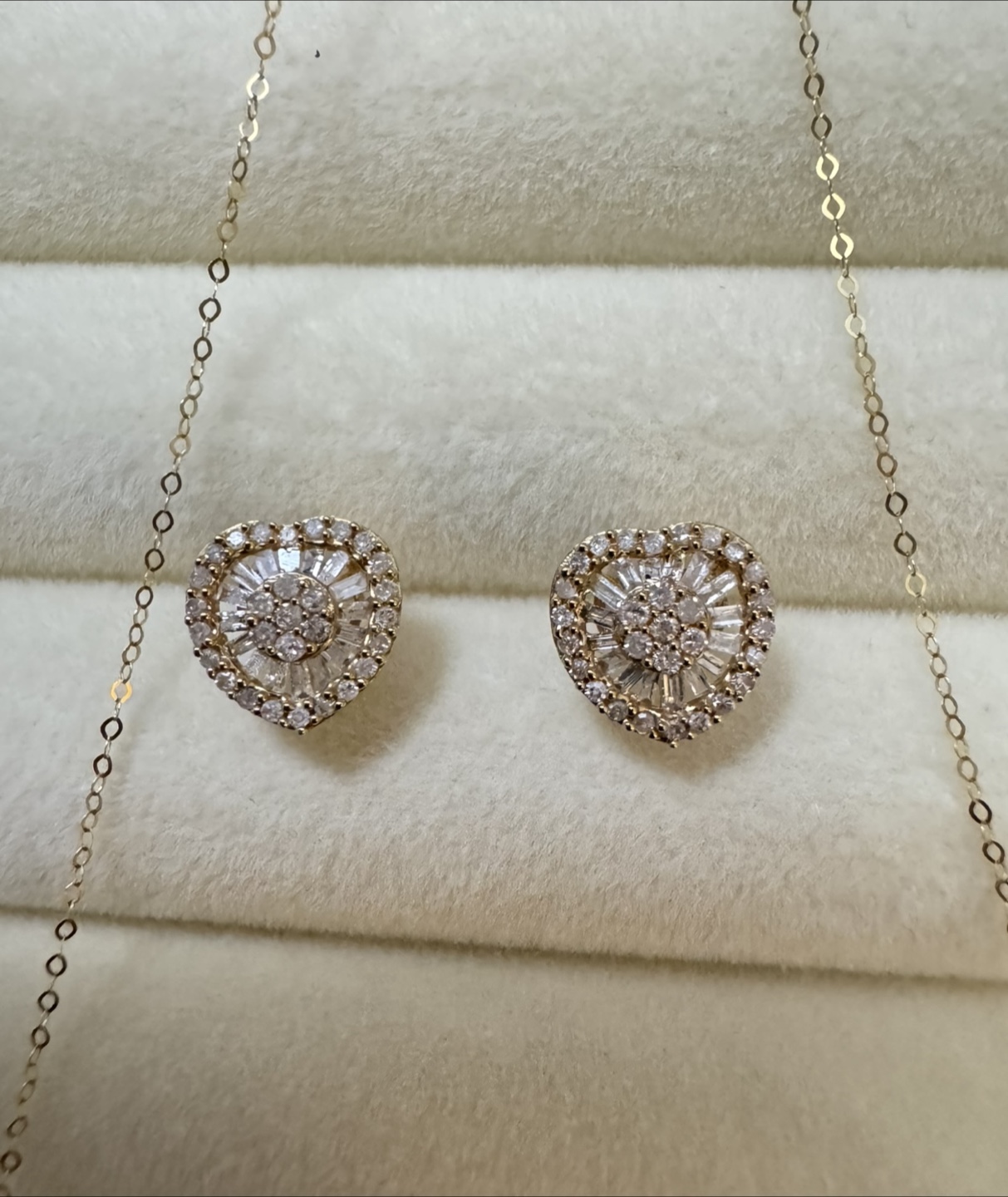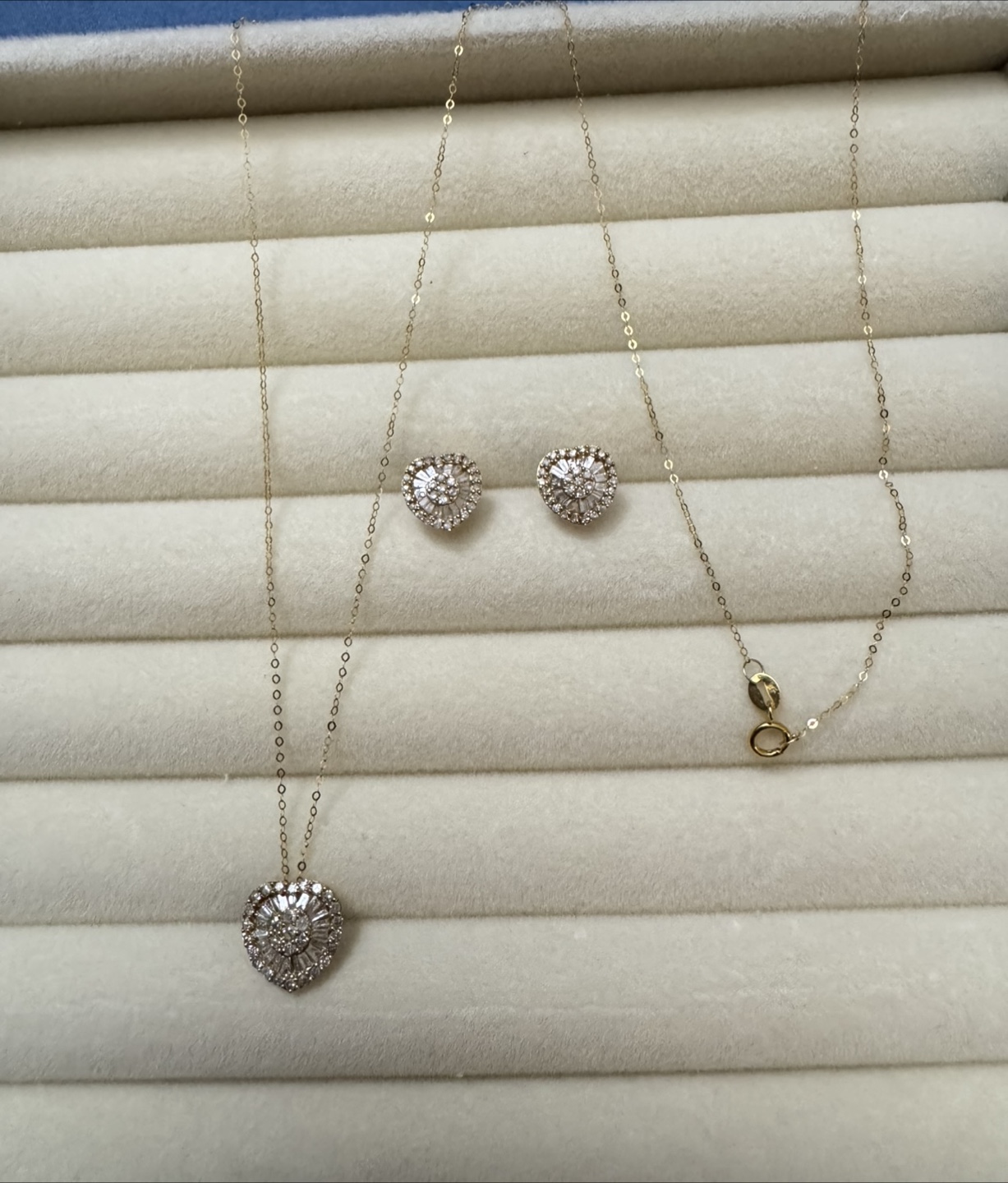 Selling a beautiful diamond heart necklace and earrings set. The certificate of gem and jewelry identification indicates the metal is Au750 (18k gold) with 0.42ct diamonds in each piece. A lovely set for a special occasion. Natural diamond. Brand new.