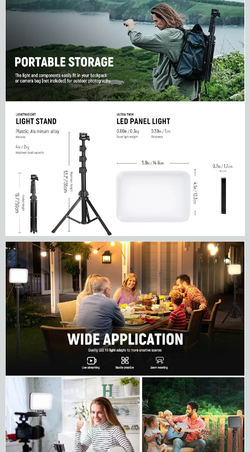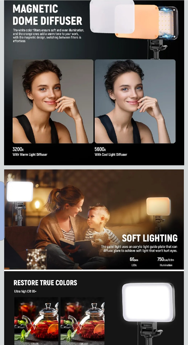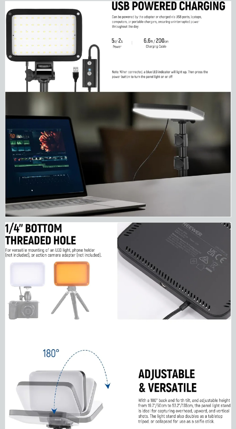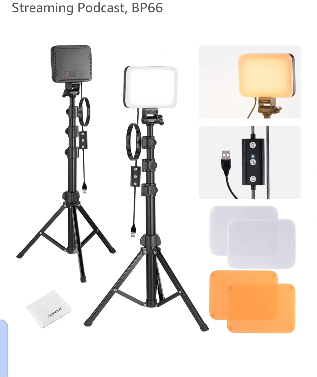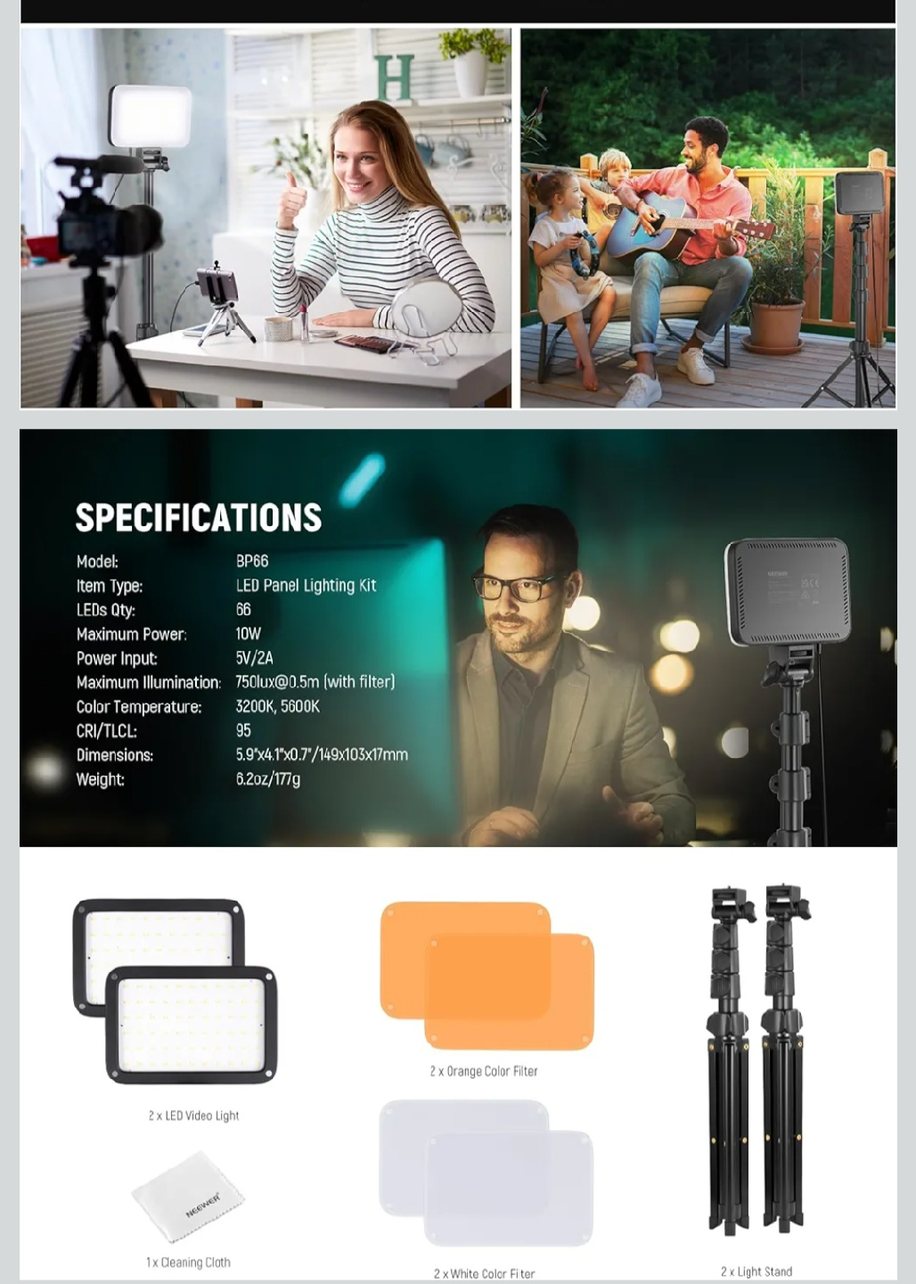 NEEWER BP66 LED panel lighting kit for streaming and podcasting. It features adjustable and versatile lighting with a 1/4" threaded bottom hole. The kit includes two LED video lights, two orange colour filters, two white colour filters, a cleaning cloth, and two light stands. It's lightweight and portable, making it easy to store in a camera bag or backpack