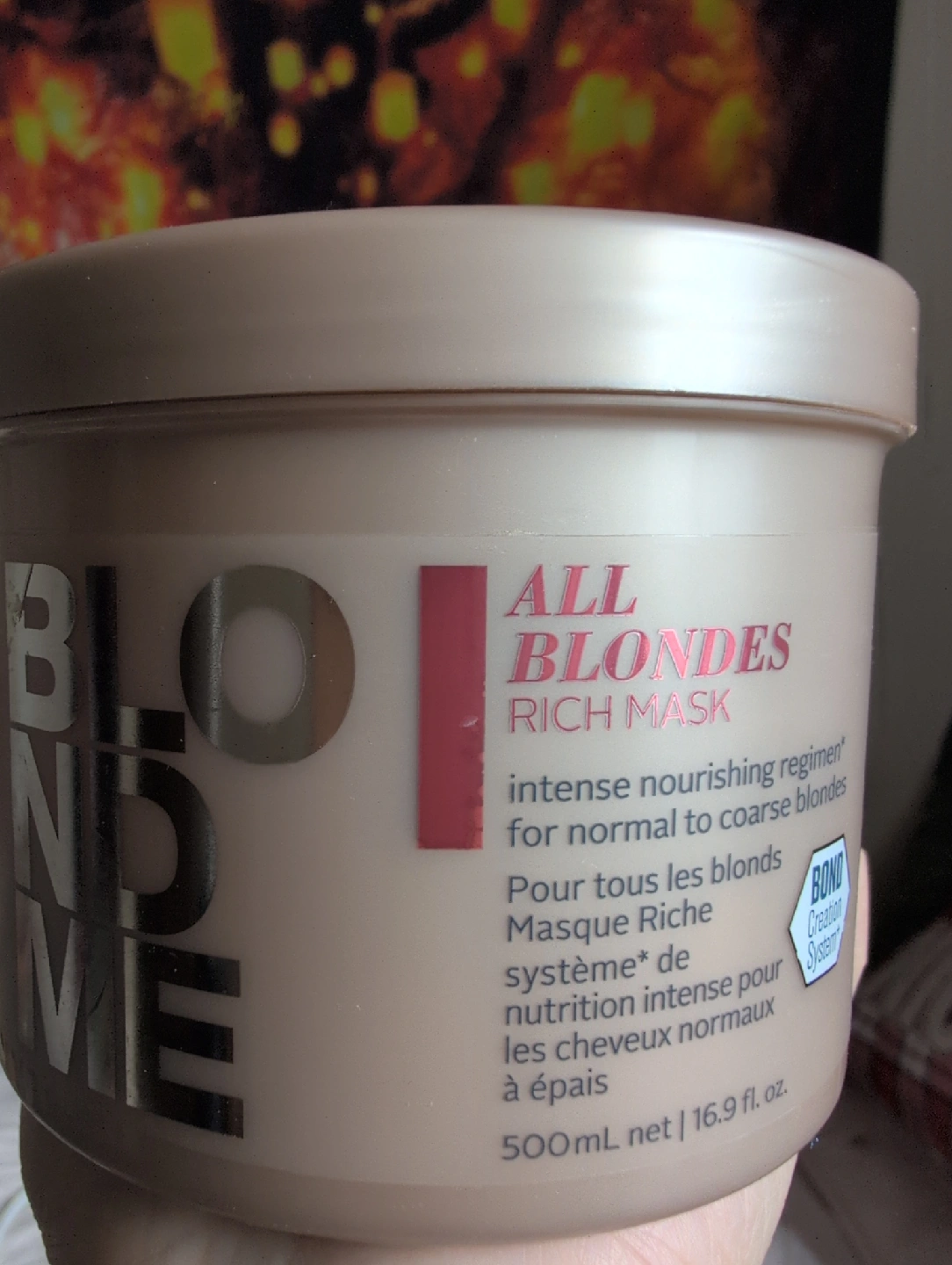 982Selling a Schwarzkopf BlondMe All Blondes Rich Mask. This mask is an intense nourishing regimen for normal to coarse blondes. It comes in a 500ml container and originally cost $34.99. There's half or more left.