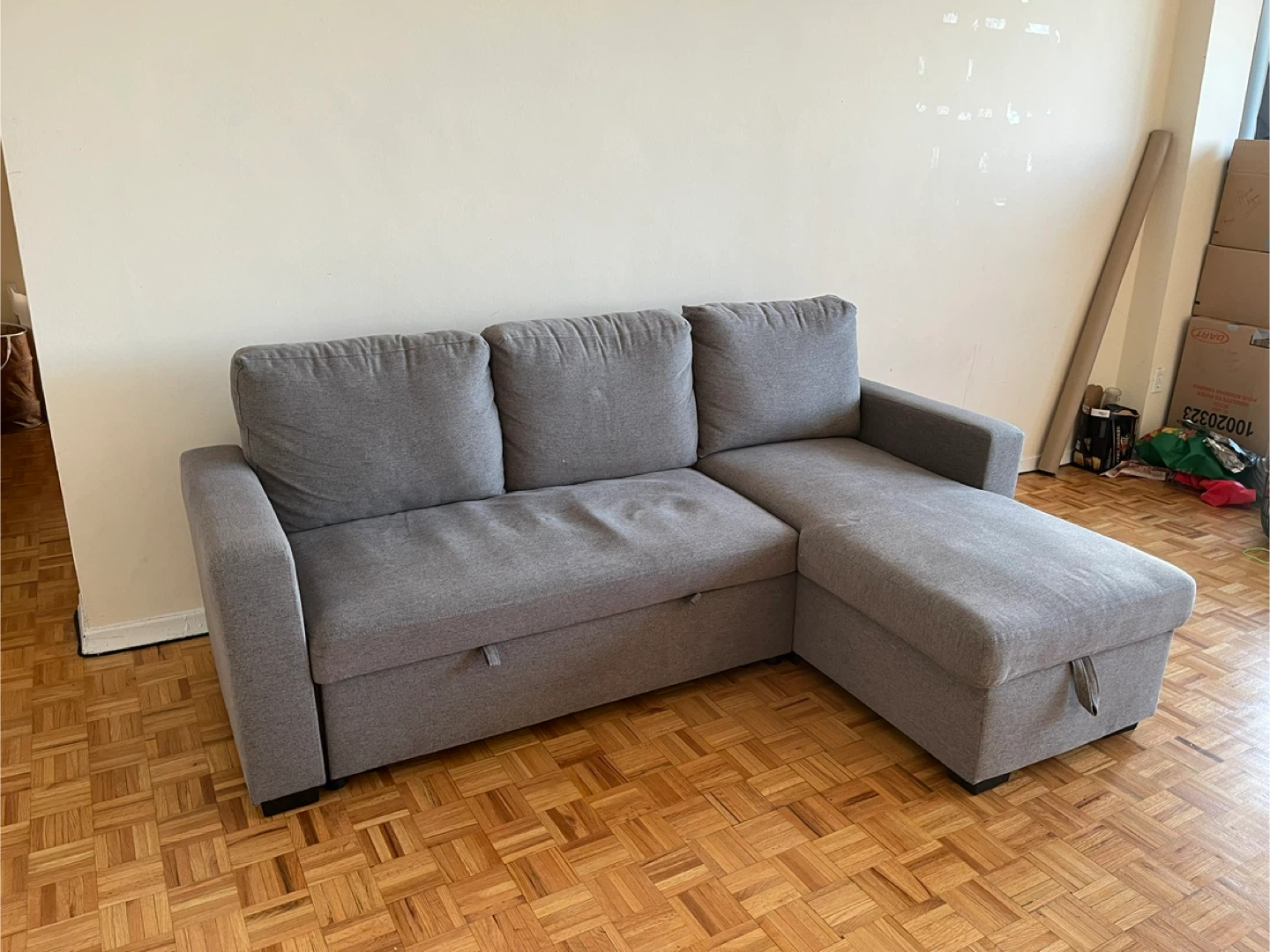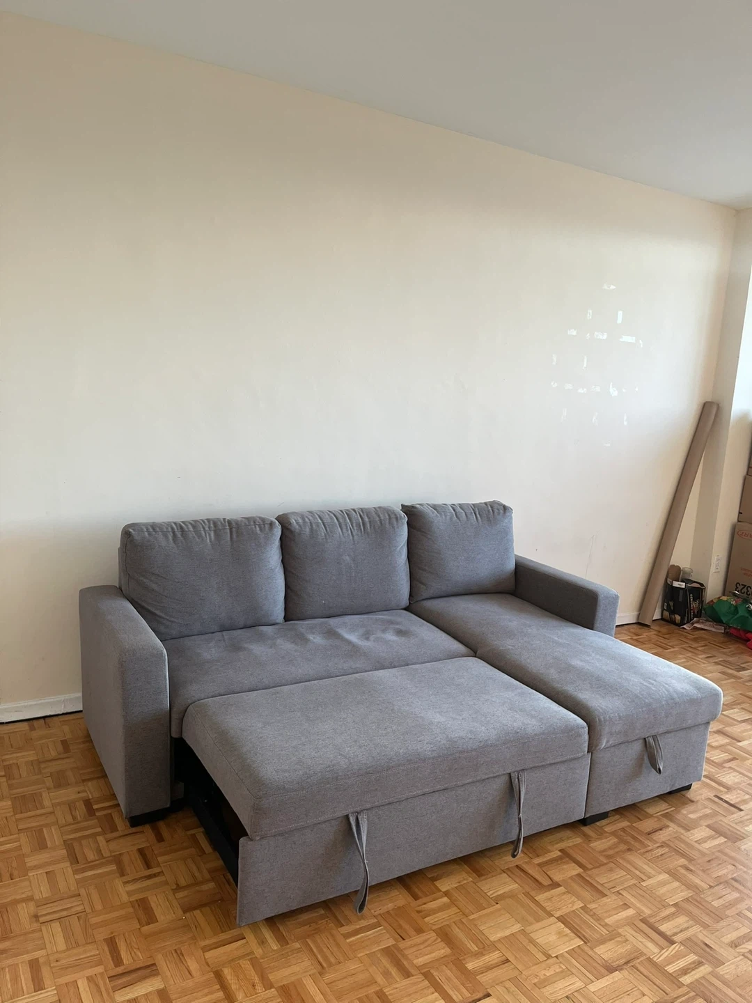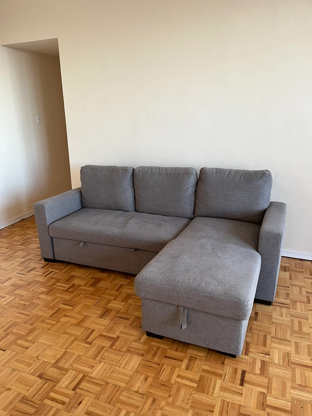 Selling a comfy grey sofa bed with a chaise lounge! It's in great shape and perfect for guests or relaxing. It easily converts into a bed for extra sleeping space. Bought it last year and selling now because I’m moving to a new furnished place. From a smoke-free and pet-free home, and works perfectly as both a comfortable couch and a pull-out bed. It also has a built-in storage compartment under the chaise, great for keeping extra bedding or blankets organized.