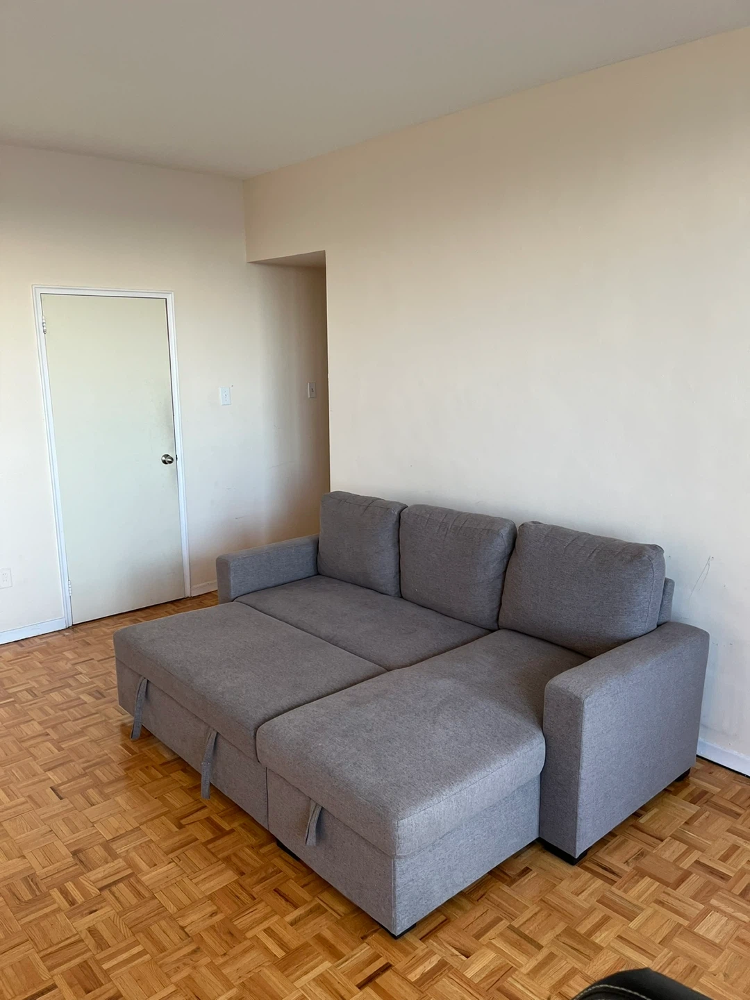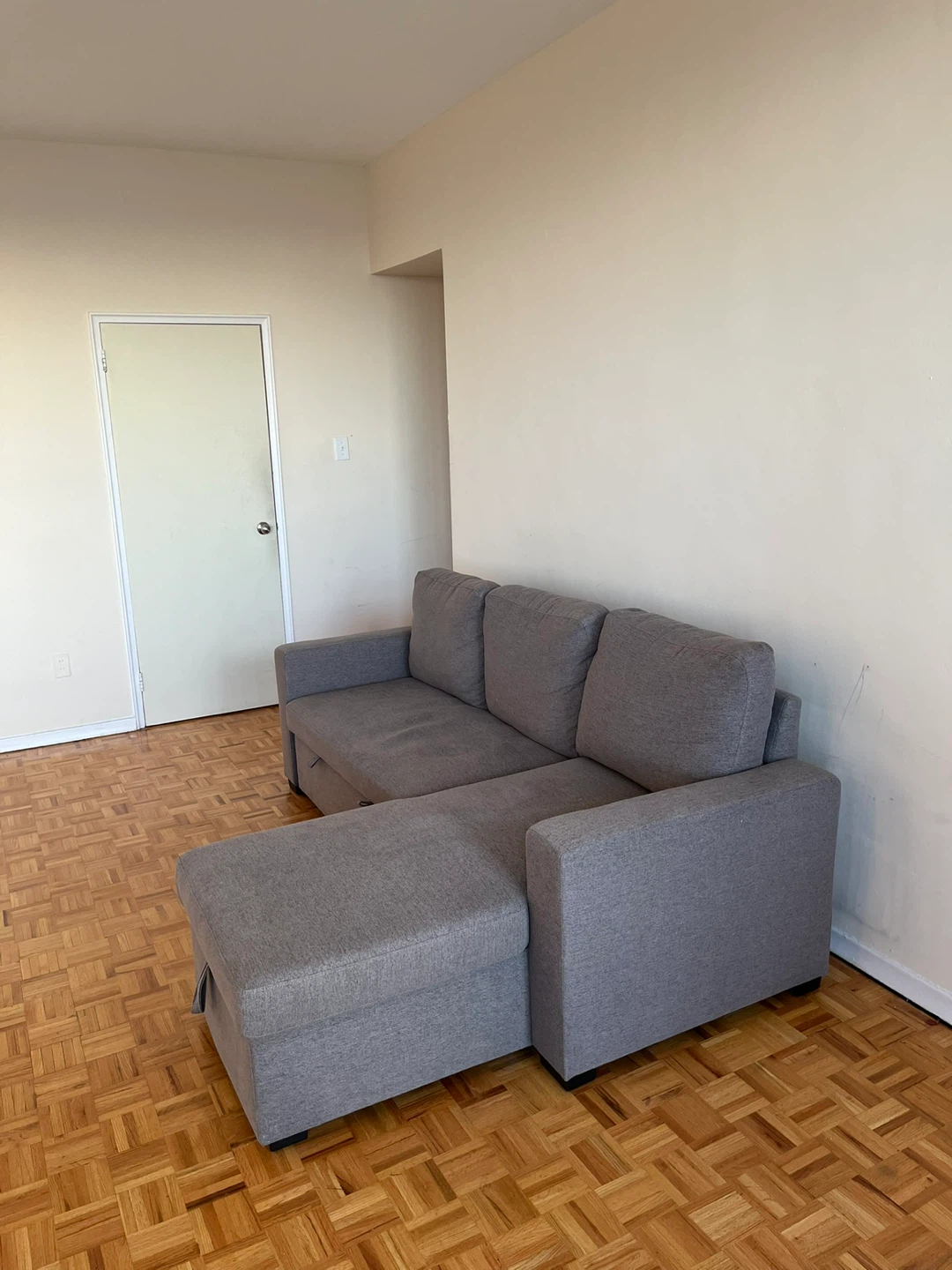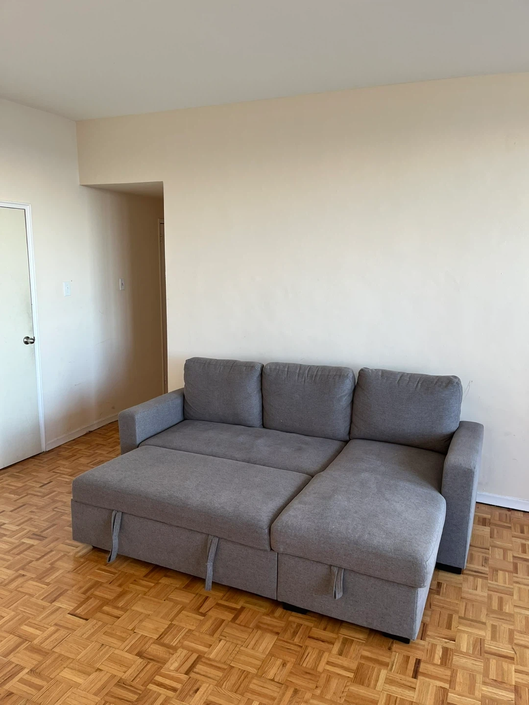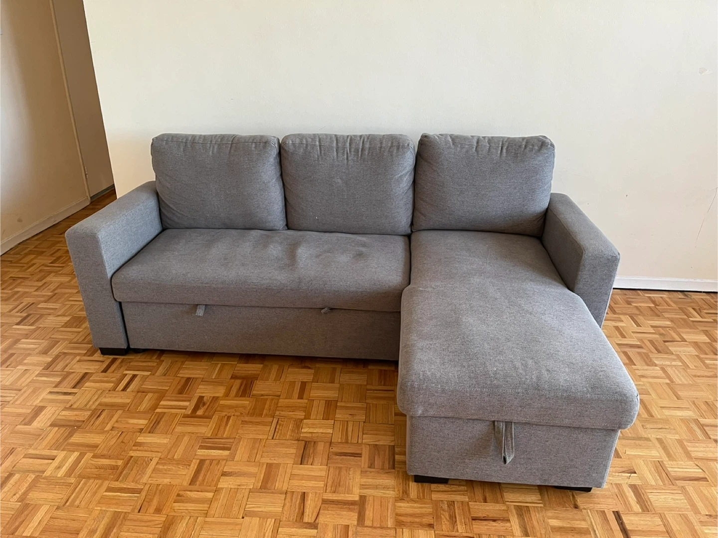 Selling a comfy grey sofa bed with a chaise lounge! It's in great shape and perfect for guests or relaxing. It easily converts into a bed for extra sleeping space. Bought it last year and selling now because I’m moving to a new furnished place. From a smoke-free and pet-free home, and works perfectly as both a comfortable couch and a pull-out bed. It also has a built-in storage compartment under the chaise, great for keeping extra bedding or blankets organized.