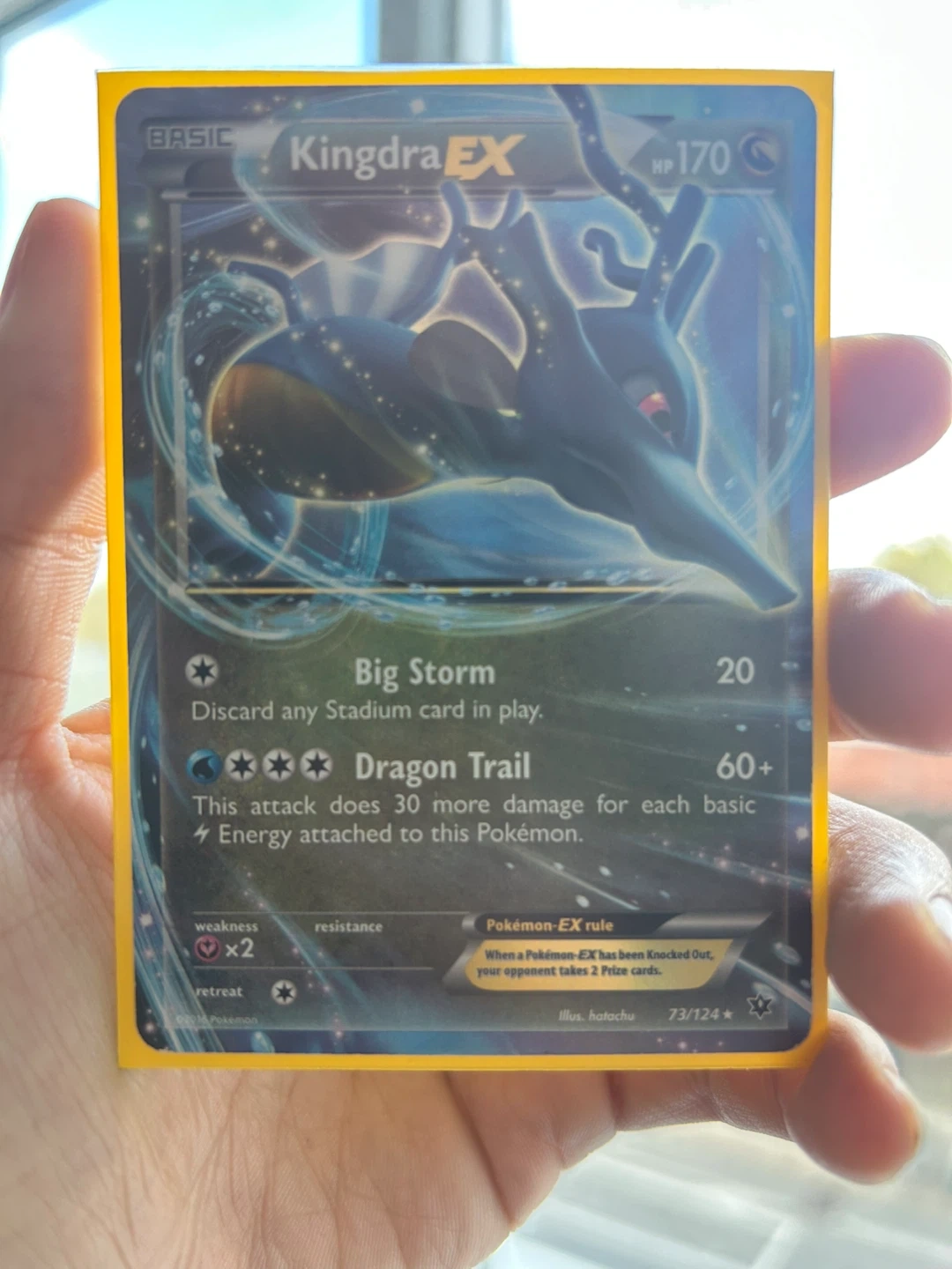 10Selling a Kingdra EX Pokemon card. The card features the 'Big Storm' and 'Dragon Trail' attacks. It has a HP of 170 and is card number 73/124.
