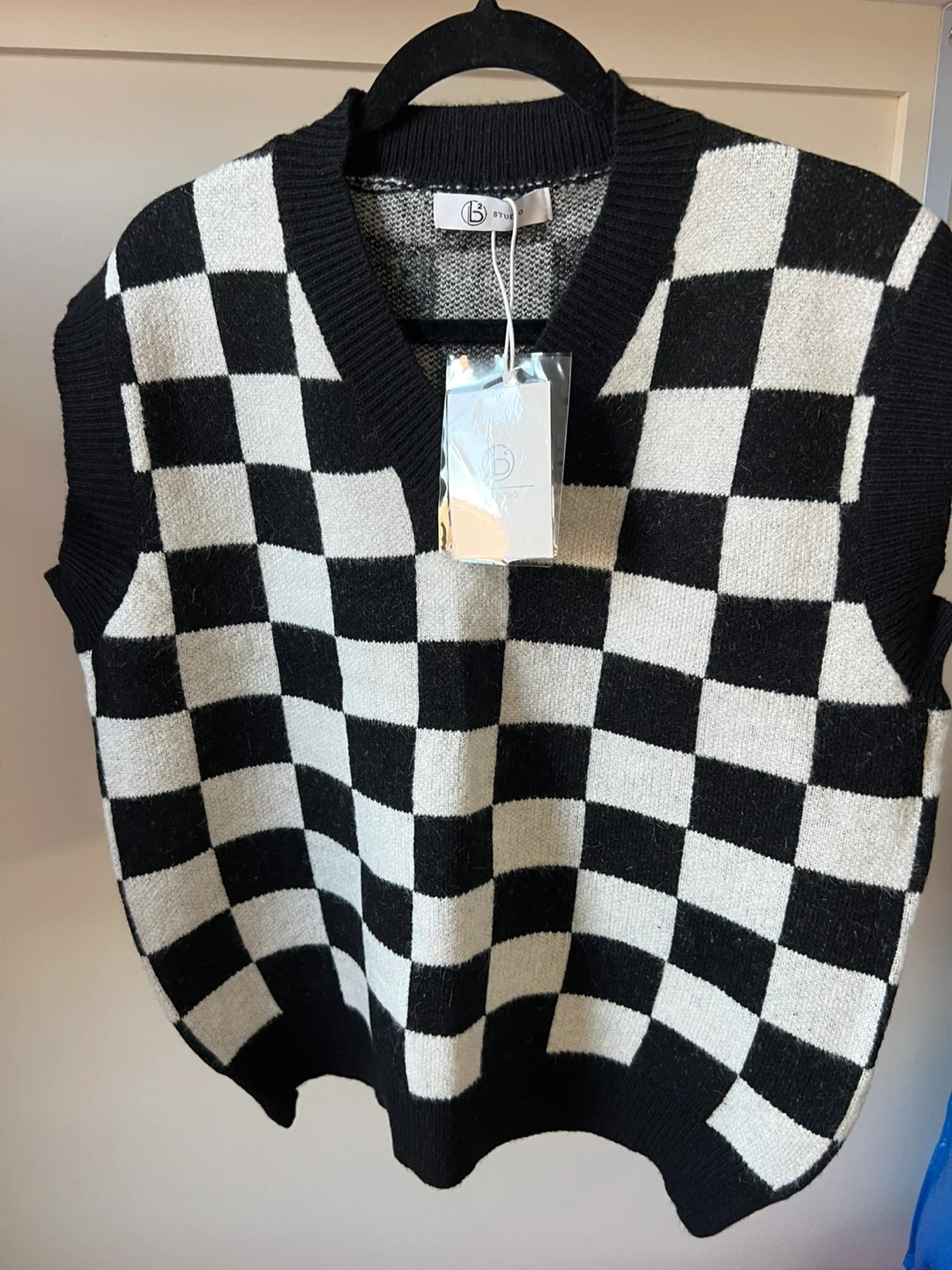 Brand new B Studio checkered knit vest with tags still attached! This stylish vest features a classic black and white checkered pattern. Perfect for layering or wearing on its own. It's in perfect condition and ready for a new home!