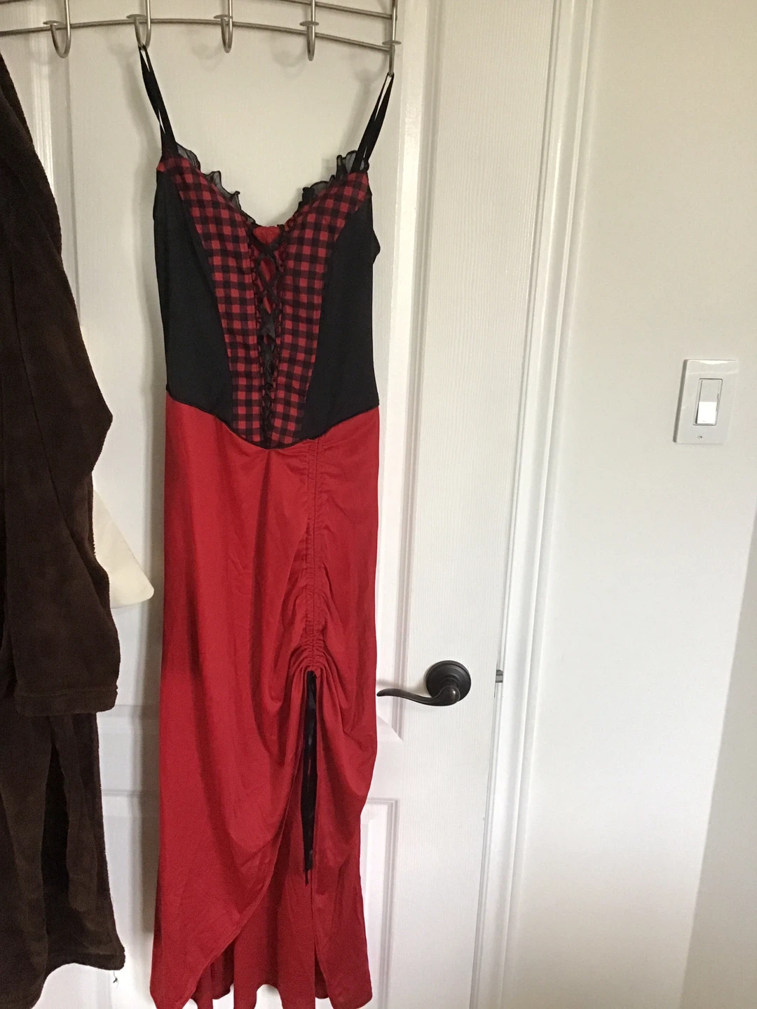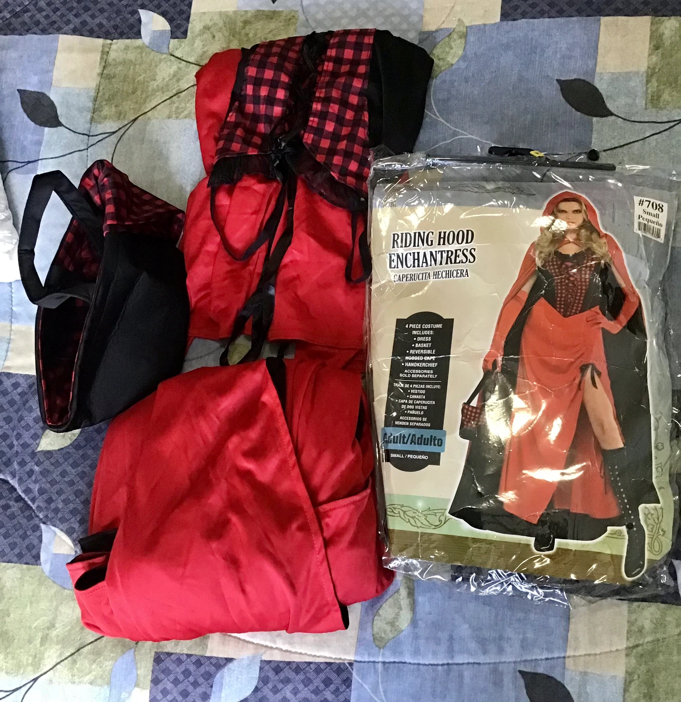 Selling a Riding Hood Enchantress costume, size adult small! This 4-piece costume includes the dress, basket, reversible hooded cape.