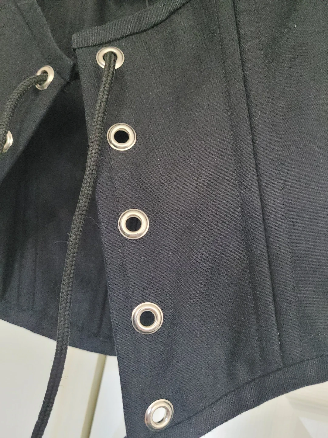 Selling a small black vest with a lace-up front. It has silver grommets and a tie closure. Works for Renaissance festivals, Oktoberfest, or just to wear casually. There is some wear and tear on the ends of the laces as shown in the photos.