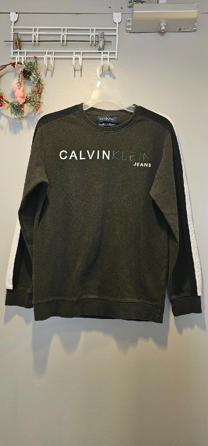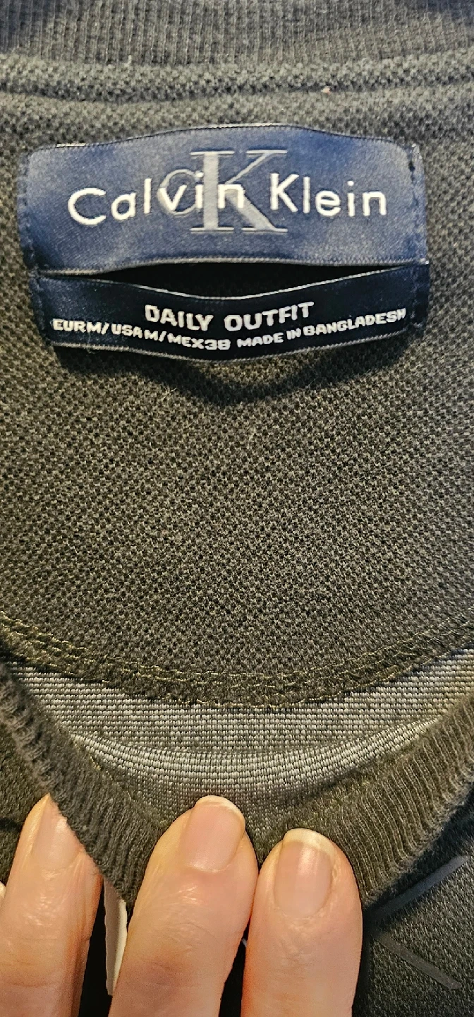 1000+Selling a Calvin Klein sweatshirt in size medium. It's a dark grey colour with white stripes on the sleeves and the Calvin Klein logo on the front. The tag indicates it's a 'Daily Outfit' style and made in Bangladesh.