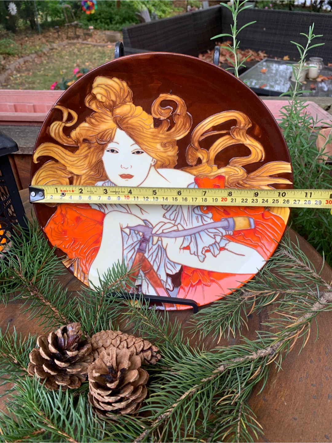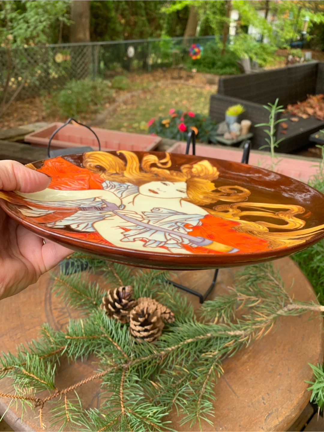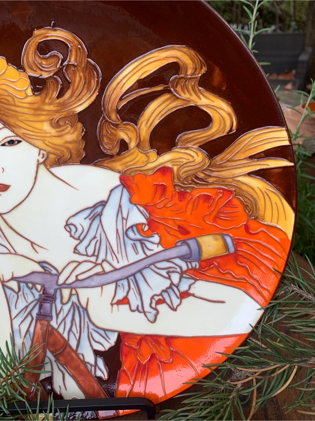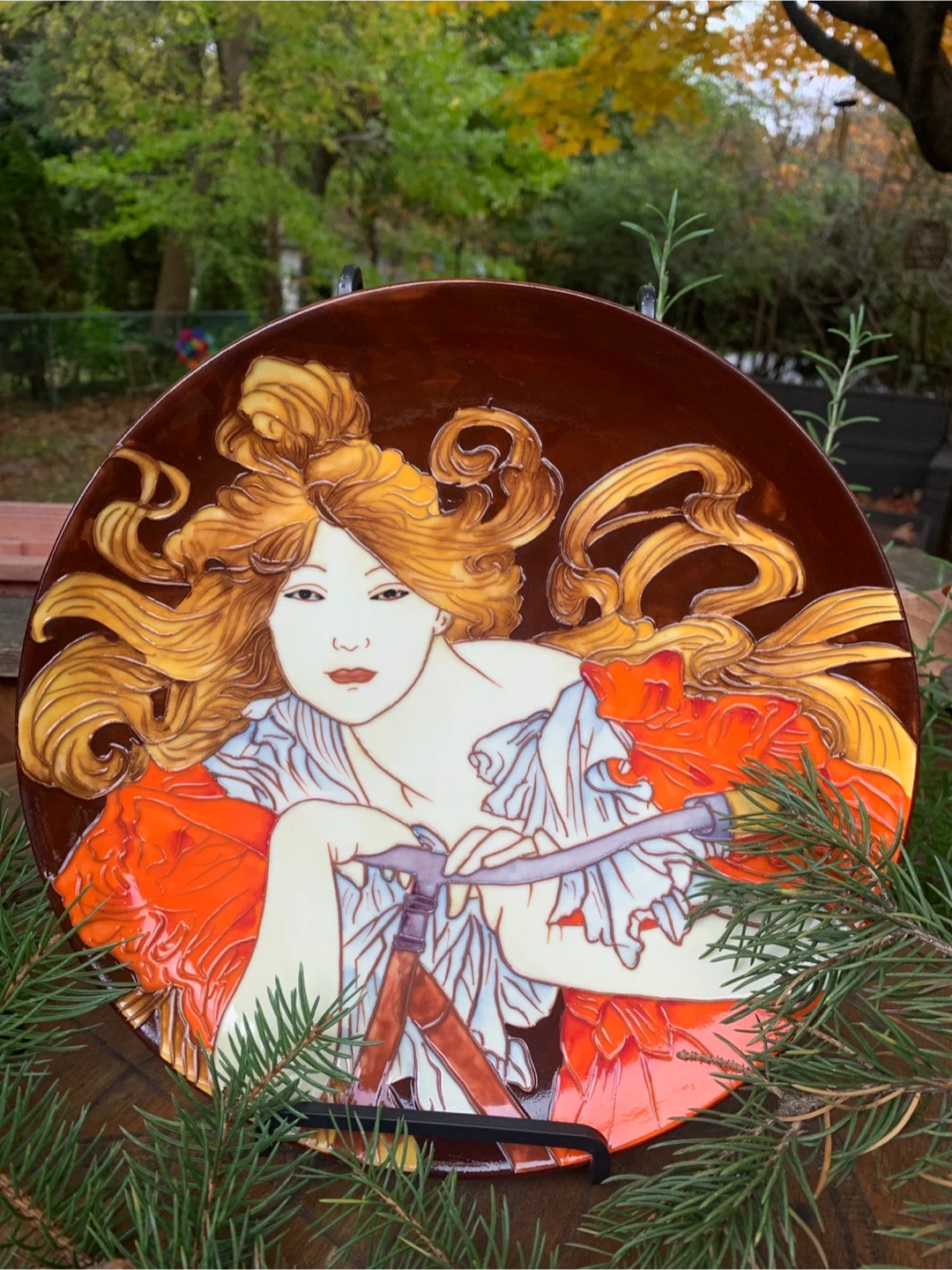Beautiful decorative plate by Benaya by Innovatron from the United Kingdom. It is in an Art Deco Style and is embossed with multiple glazes. It is a hand painted woman entitled, BICYCLETTE. A stunning plate that and would look great in any home. In excellent condition with no chips cracks or crazing. Would be beautiful on a stand or hung on a wall. The colours are just vibrant!