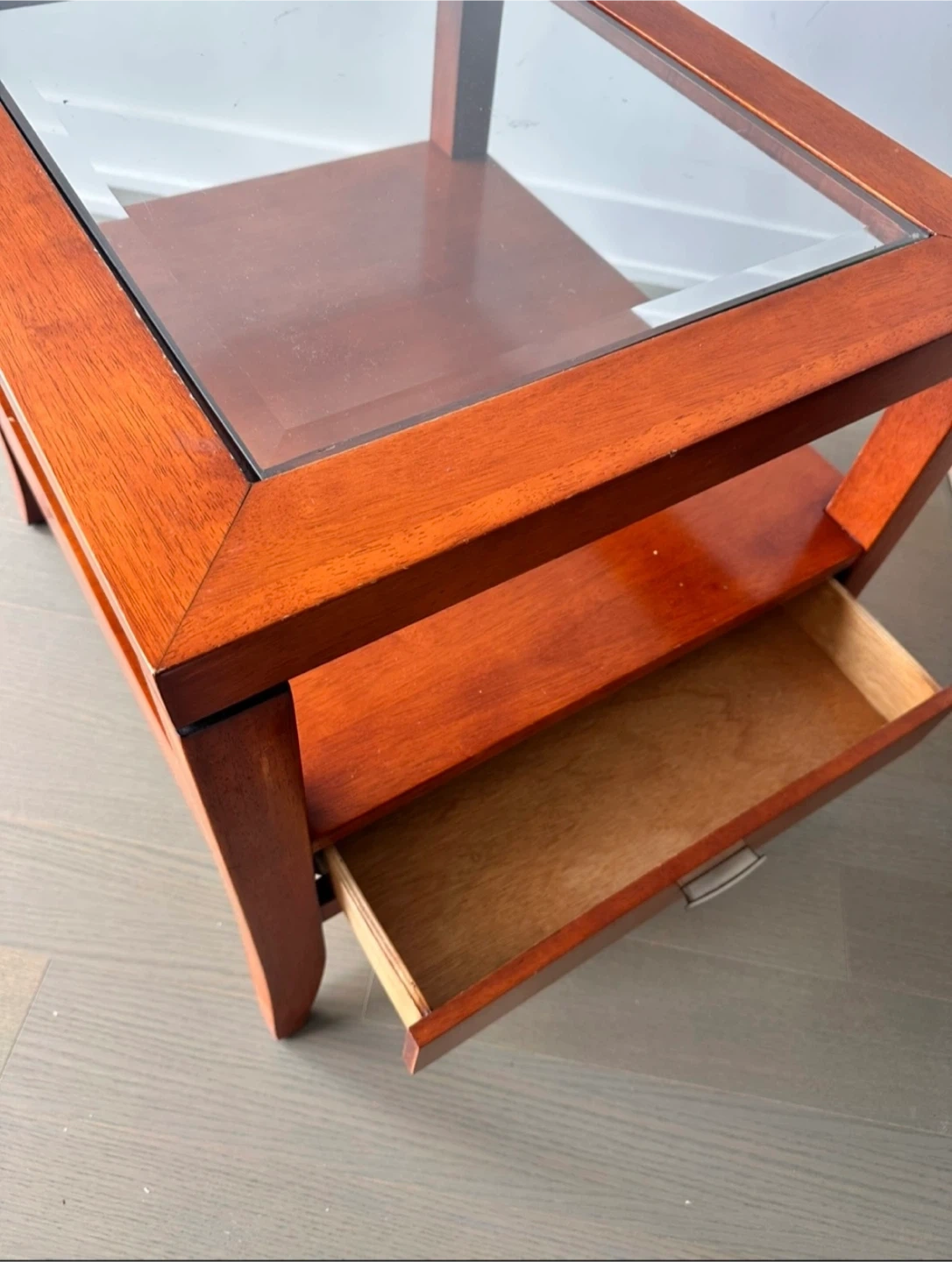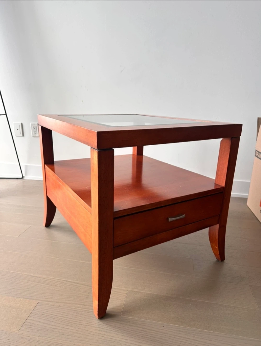 A lovely wood coffee table with a glass top and a handy little drawer! It would be a great addition to any living room or den