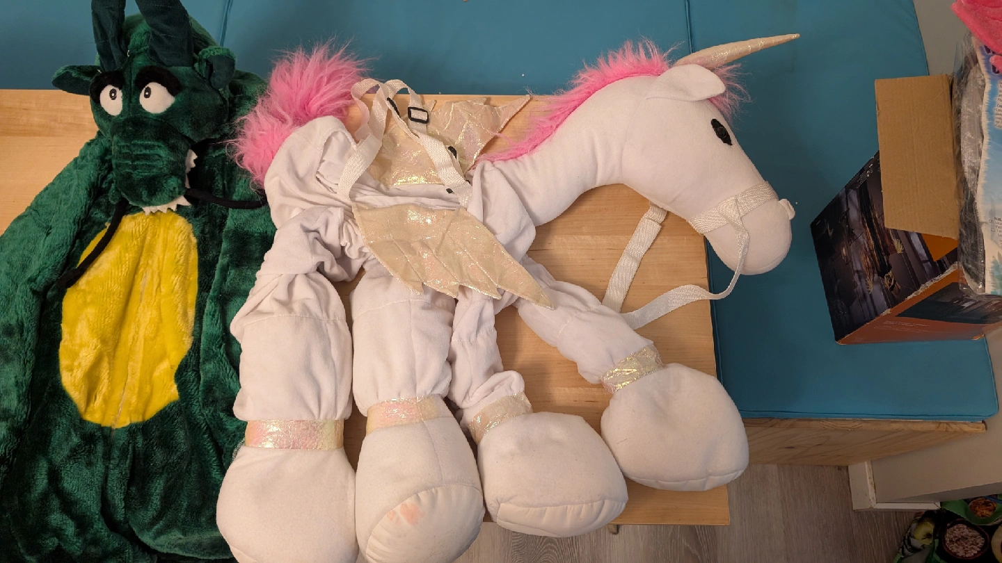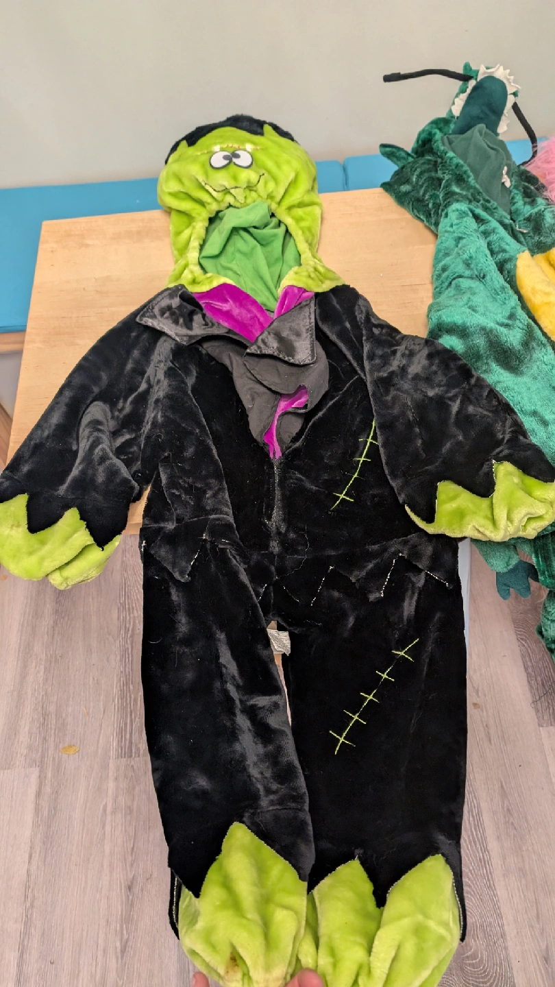 Selling a variety of kids' Halloween costumes, including a Frankenstein monster, a dragon, and a unicorn! Perfect for dress-up or Halloween fun. They're in good condition and ready for a new home. the dragon has a rip on the knee.