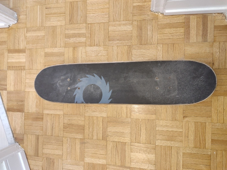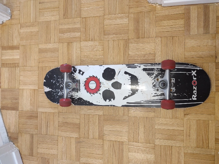 Selling a RazorX skateboard. It has a skull design on the top. The wheels are red. It has some wear and tear.