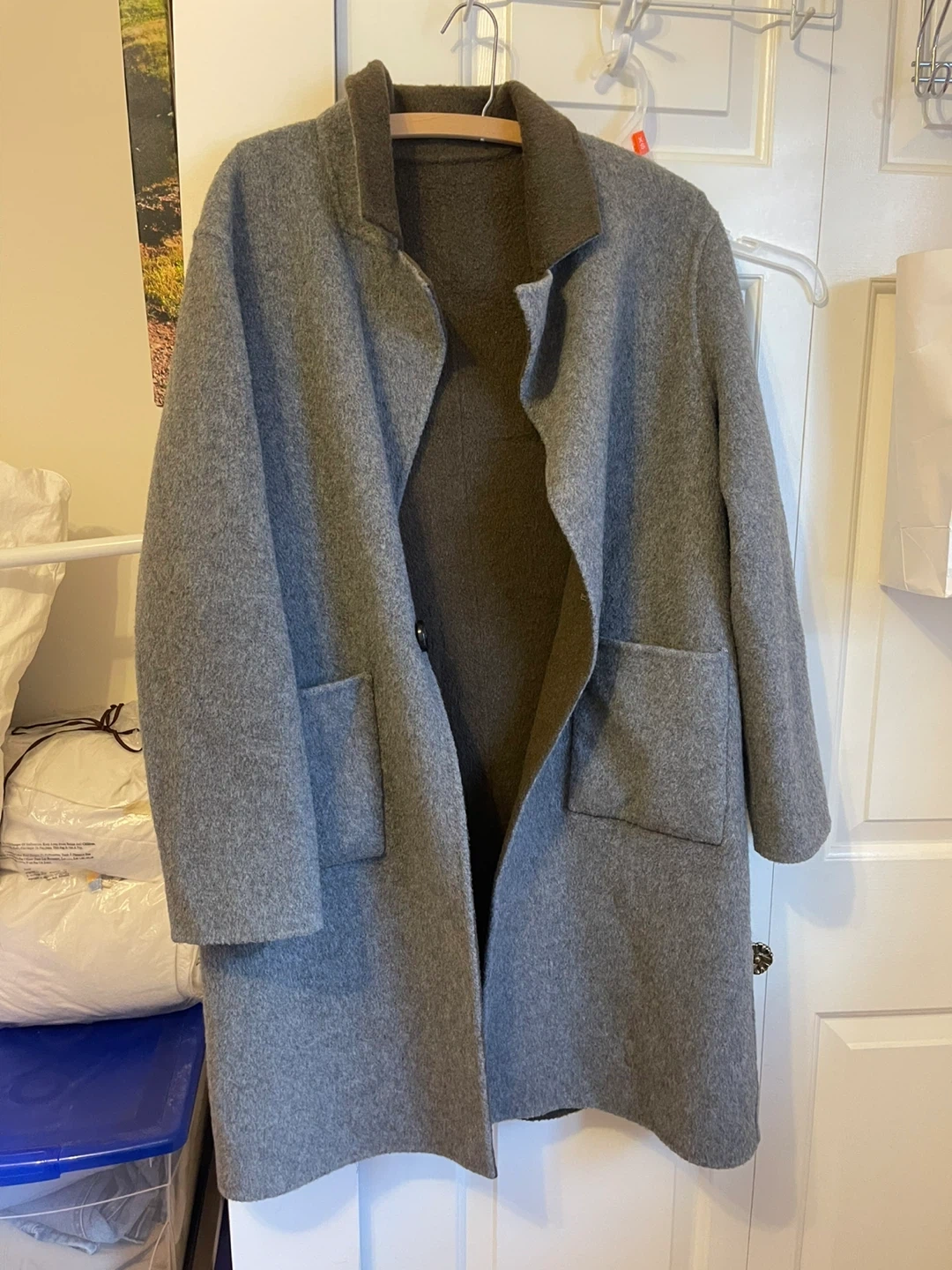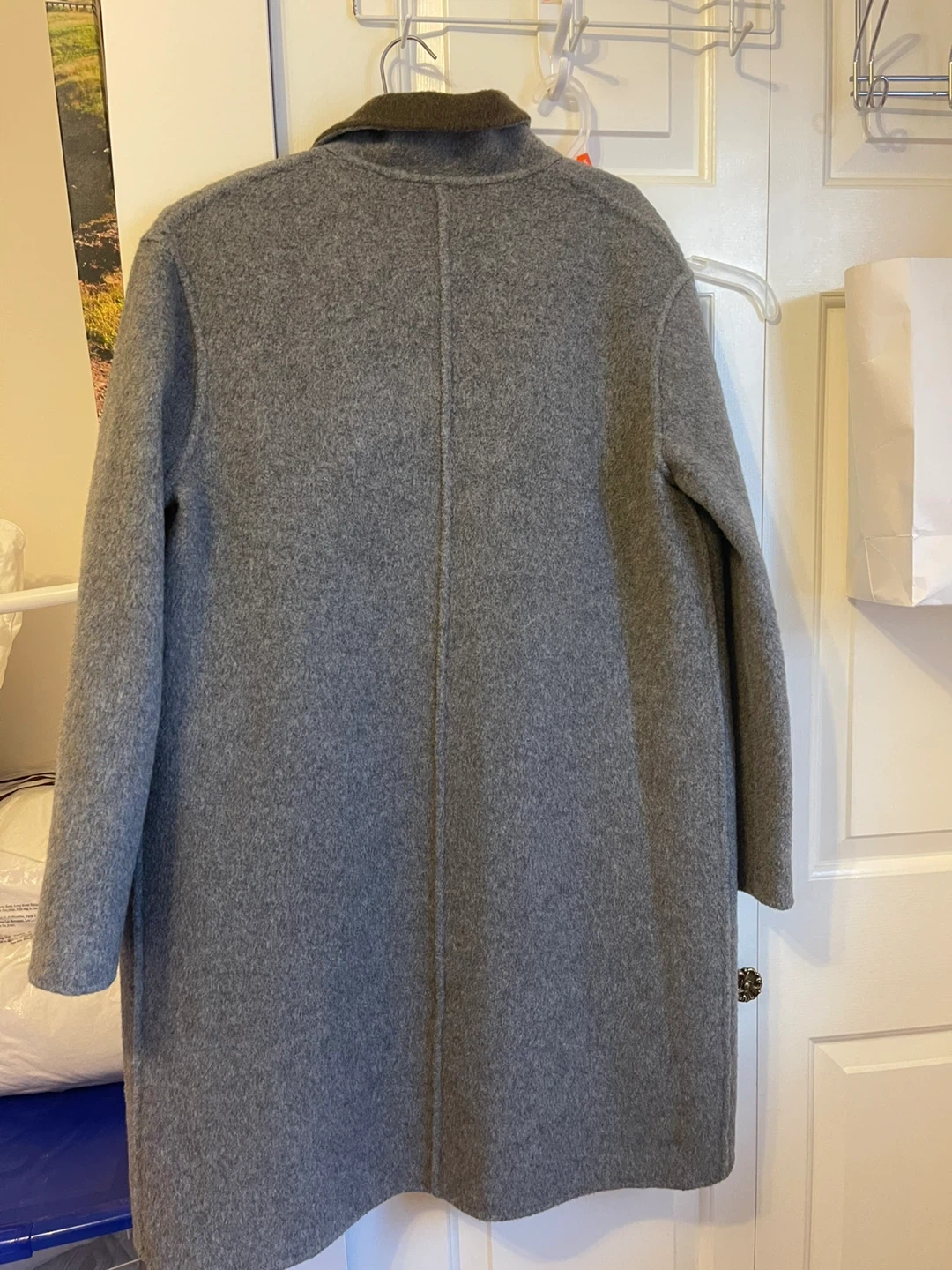 20Selling a stylish grey wool blend coat! It's in great condition and perfect for layering during the cooler months. The coat features a classic design with functional pockets. It's a versatile piece that can be dressed up or down, making it a great addition to any wardrobe