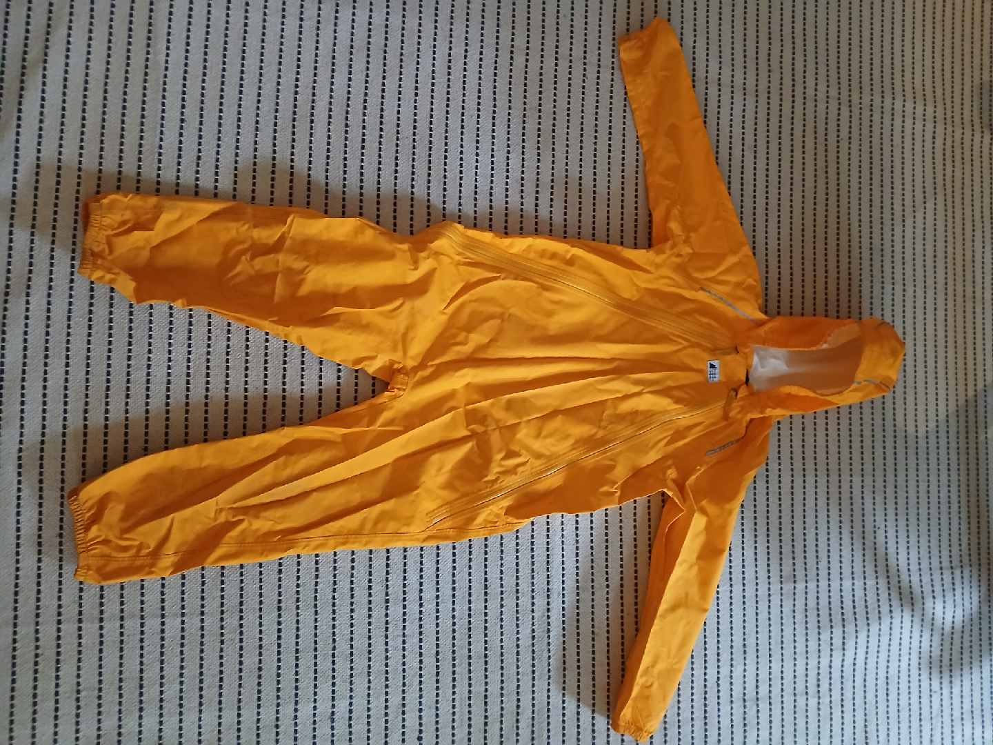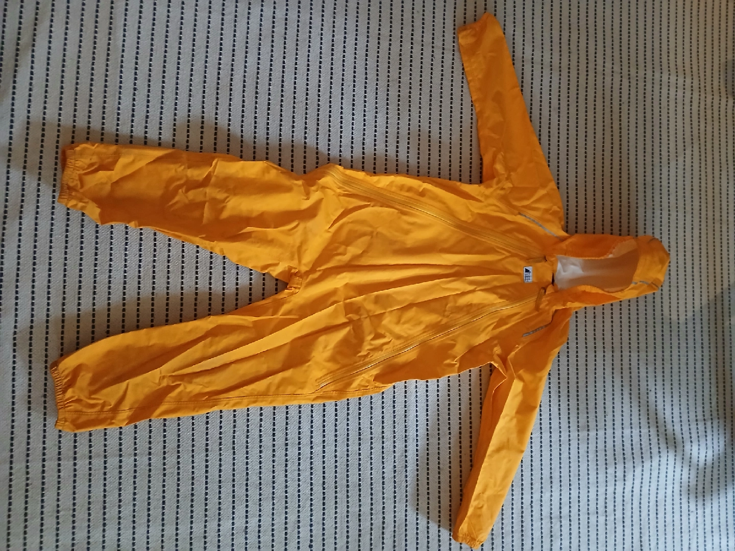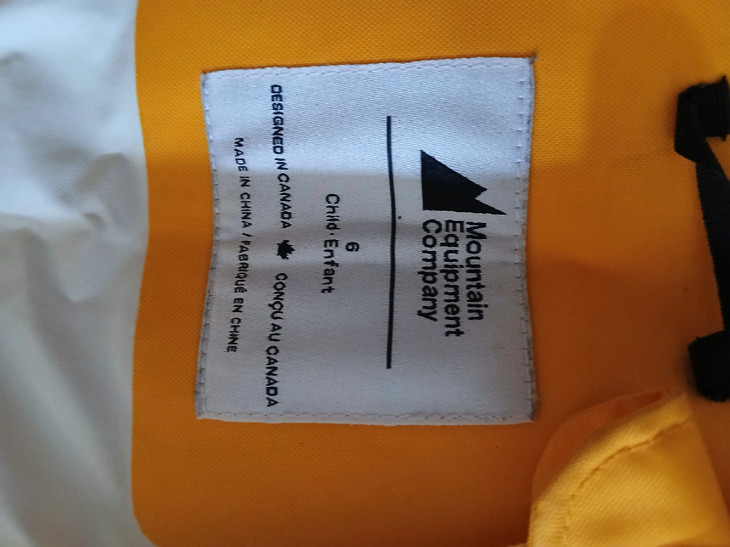 Keep your little one dry with this Mountain Equipment Co-op rain suit! It's a bright yellow colour and size 6. Designed in Canada, it's perfect for those rainy days.