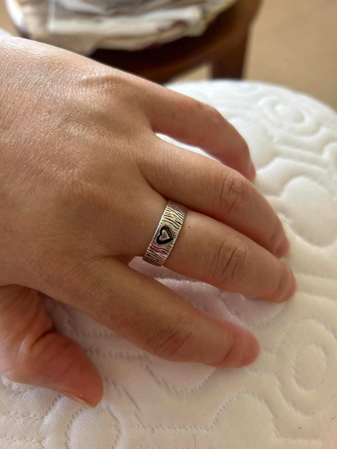 Here's a lovely Silpada ring made of 925 sterling silver! It has a textured design and a cute heart accent. The ring is stamped with '925' and 'Silpada' on the inside. It's in great condition and ready for a new home