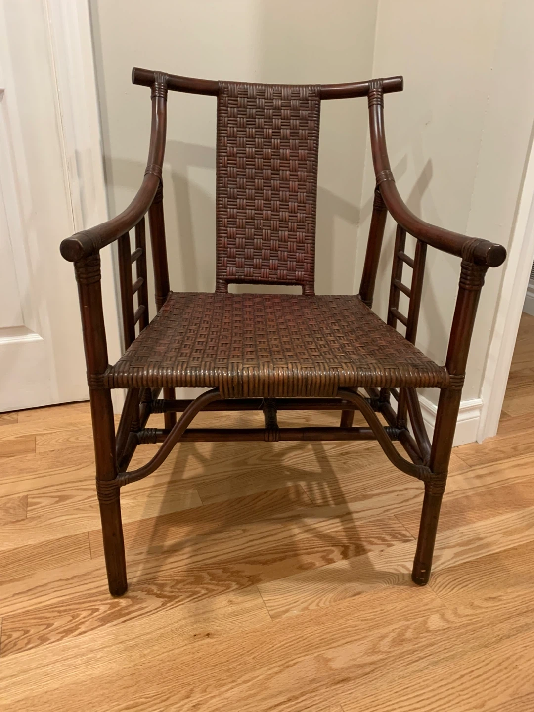 This armchair is made out of a bamboo frame and woven cane seat and back. It is designed after Parzinger with a Chinese influence and an Asia Modern style.