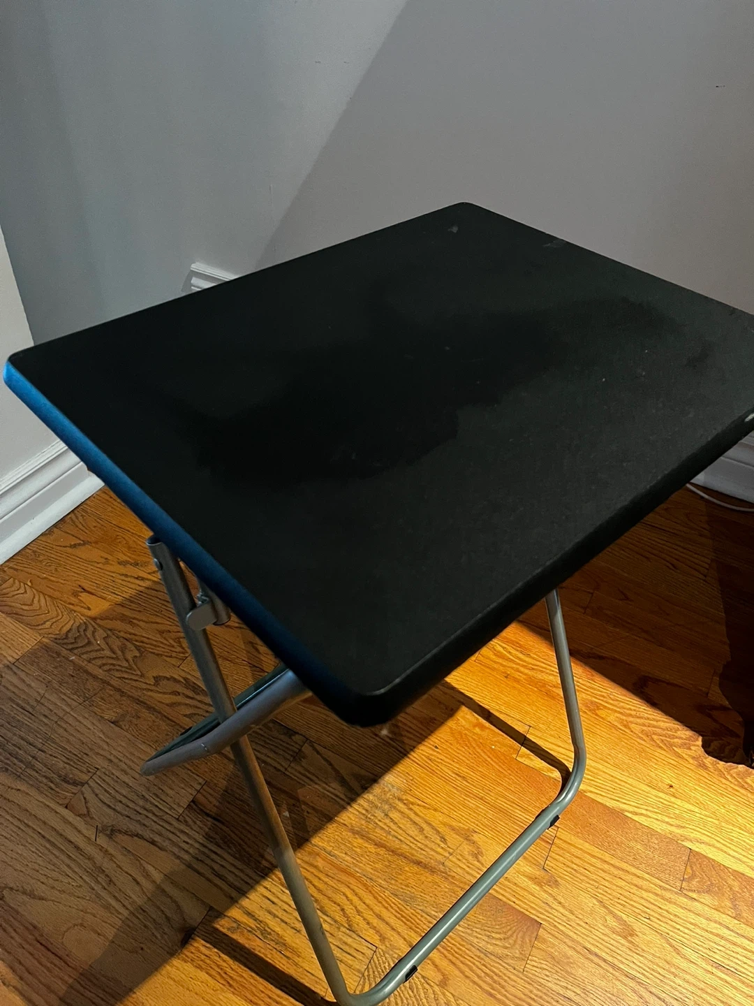 Selling a handy black folding table! It's lightweight and folds up easily for storage, so it's great for small spaces.