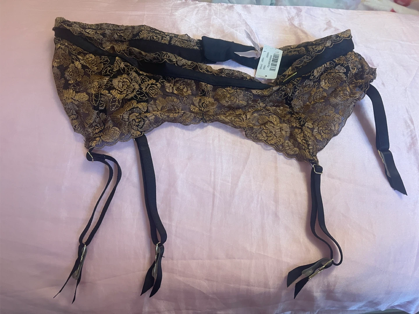Selling a La Vie en Rose garter belt in black and gold lace. It's in great condition and ready to add a touch of elegance to your lingerie collection