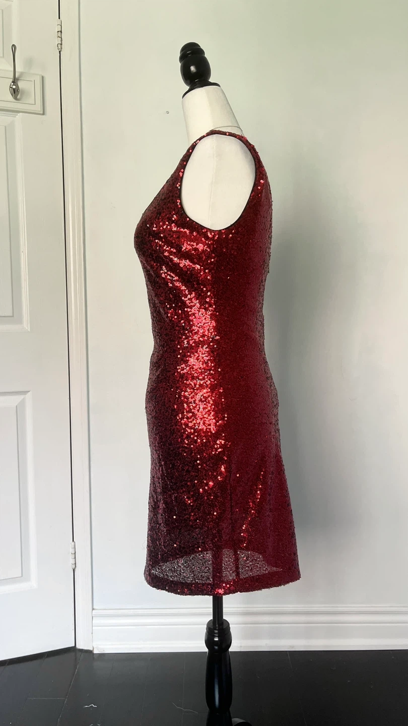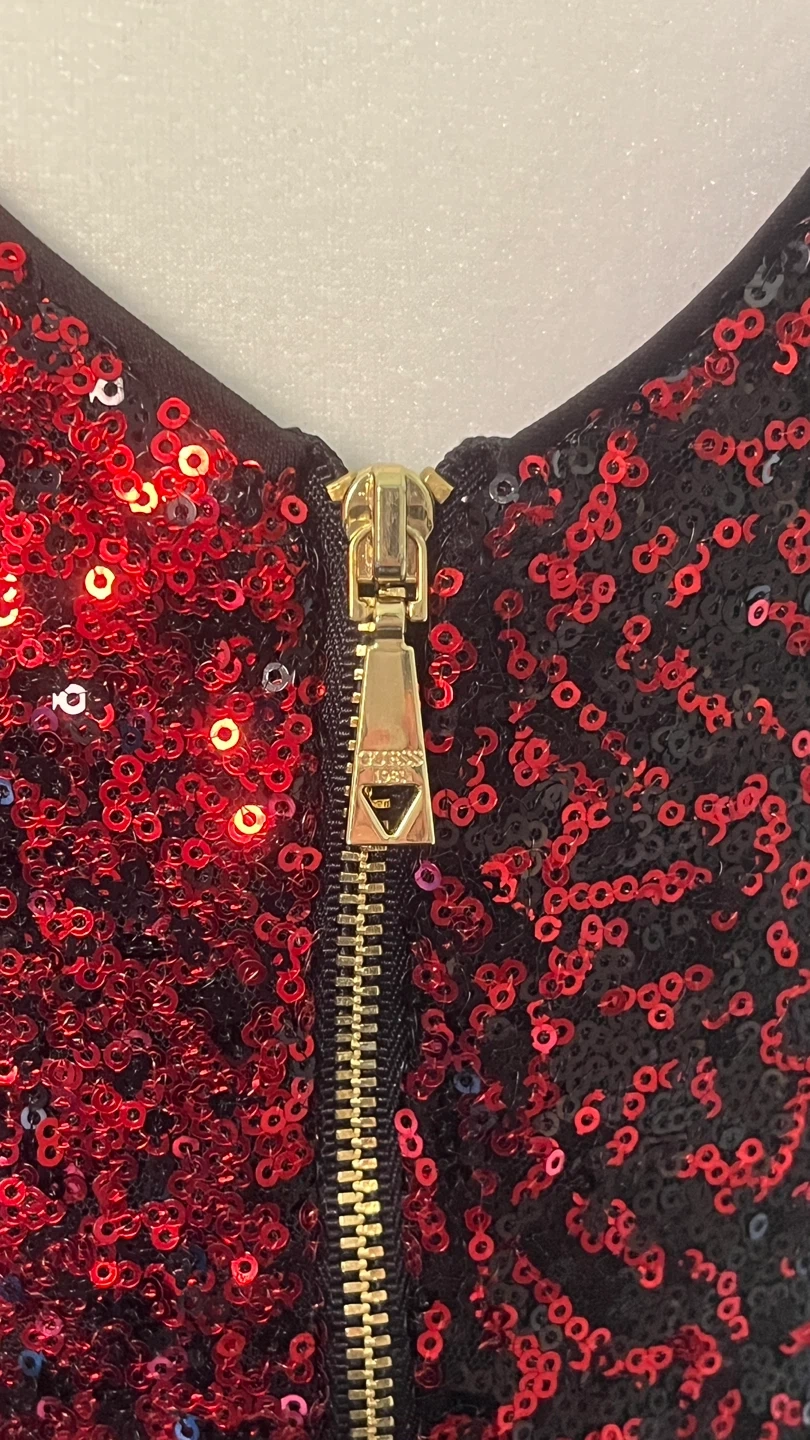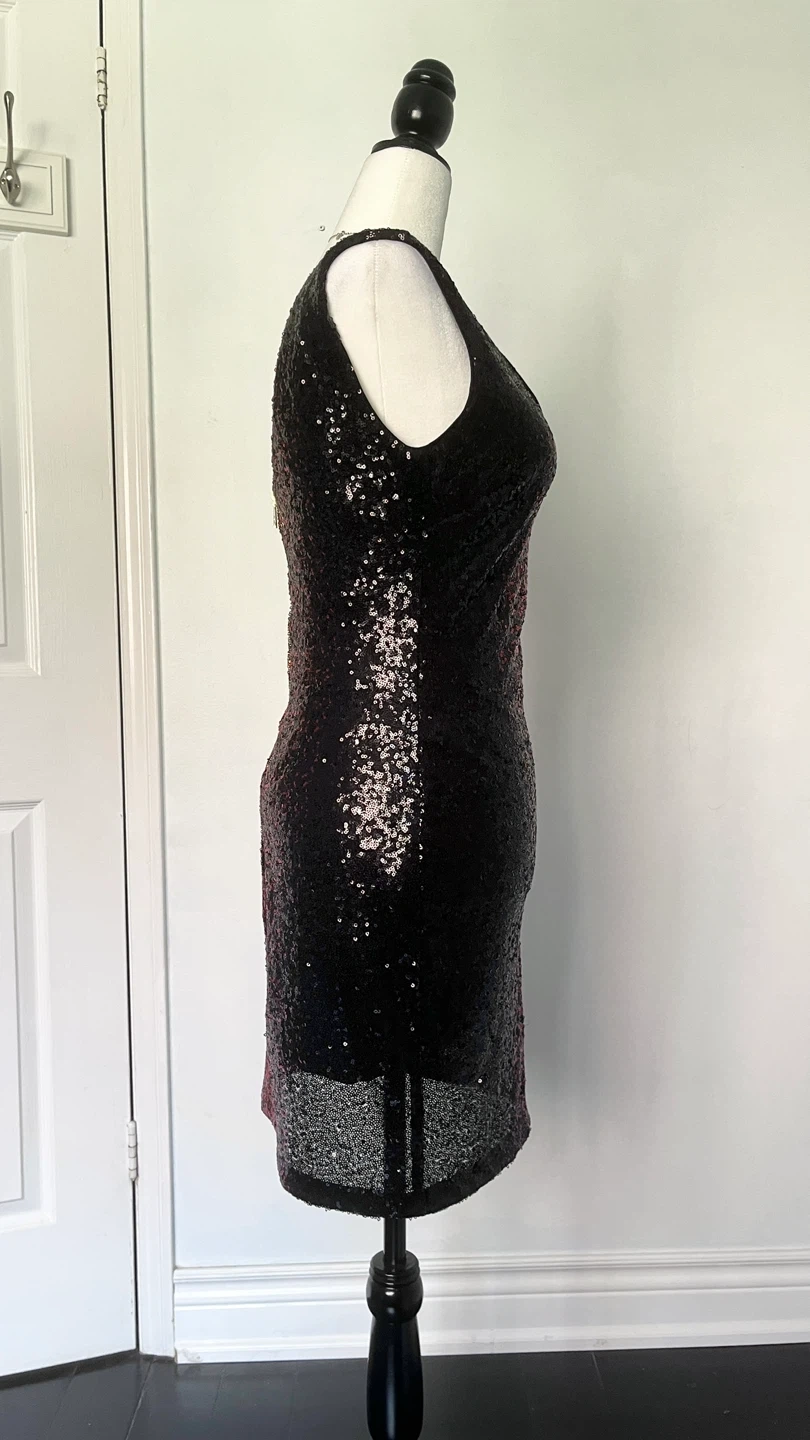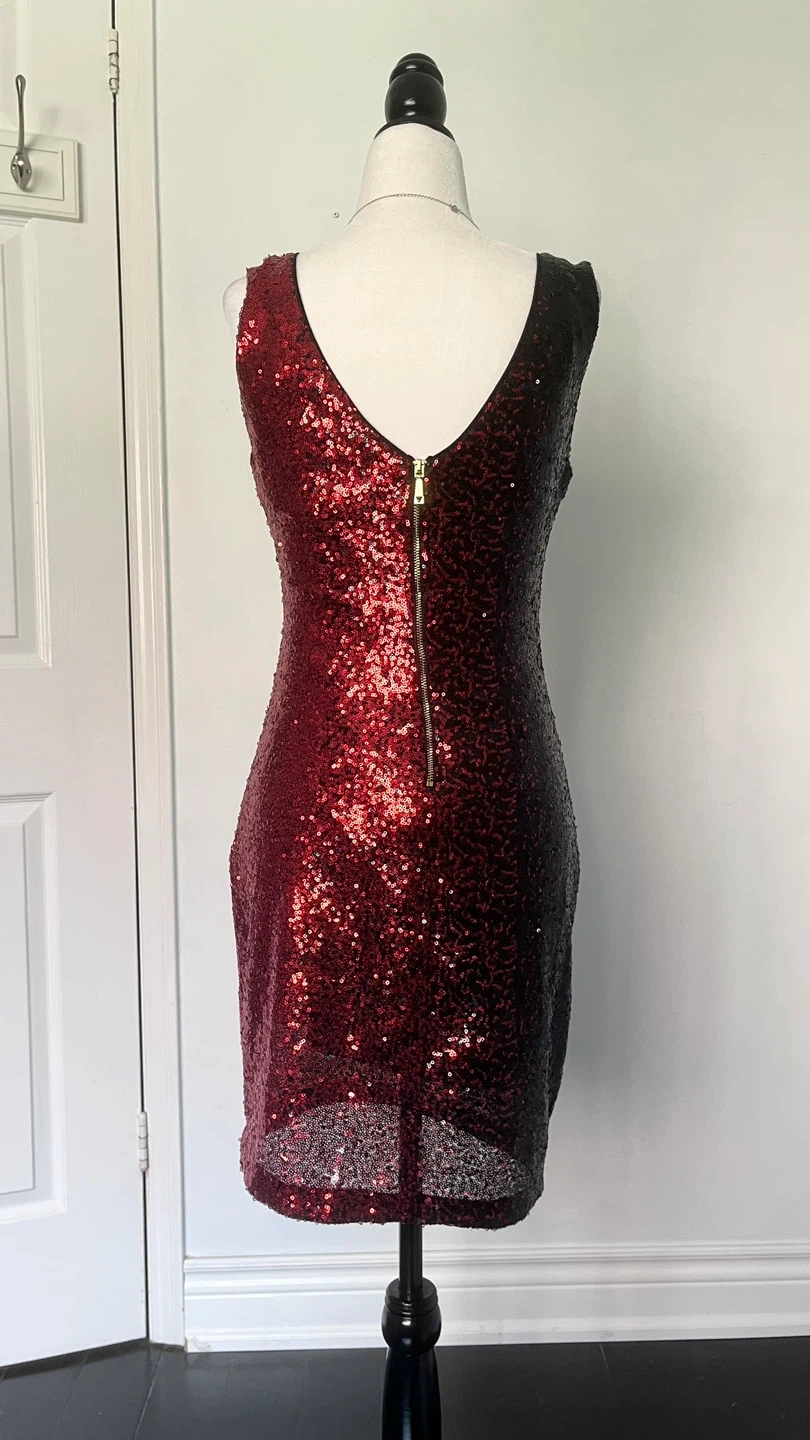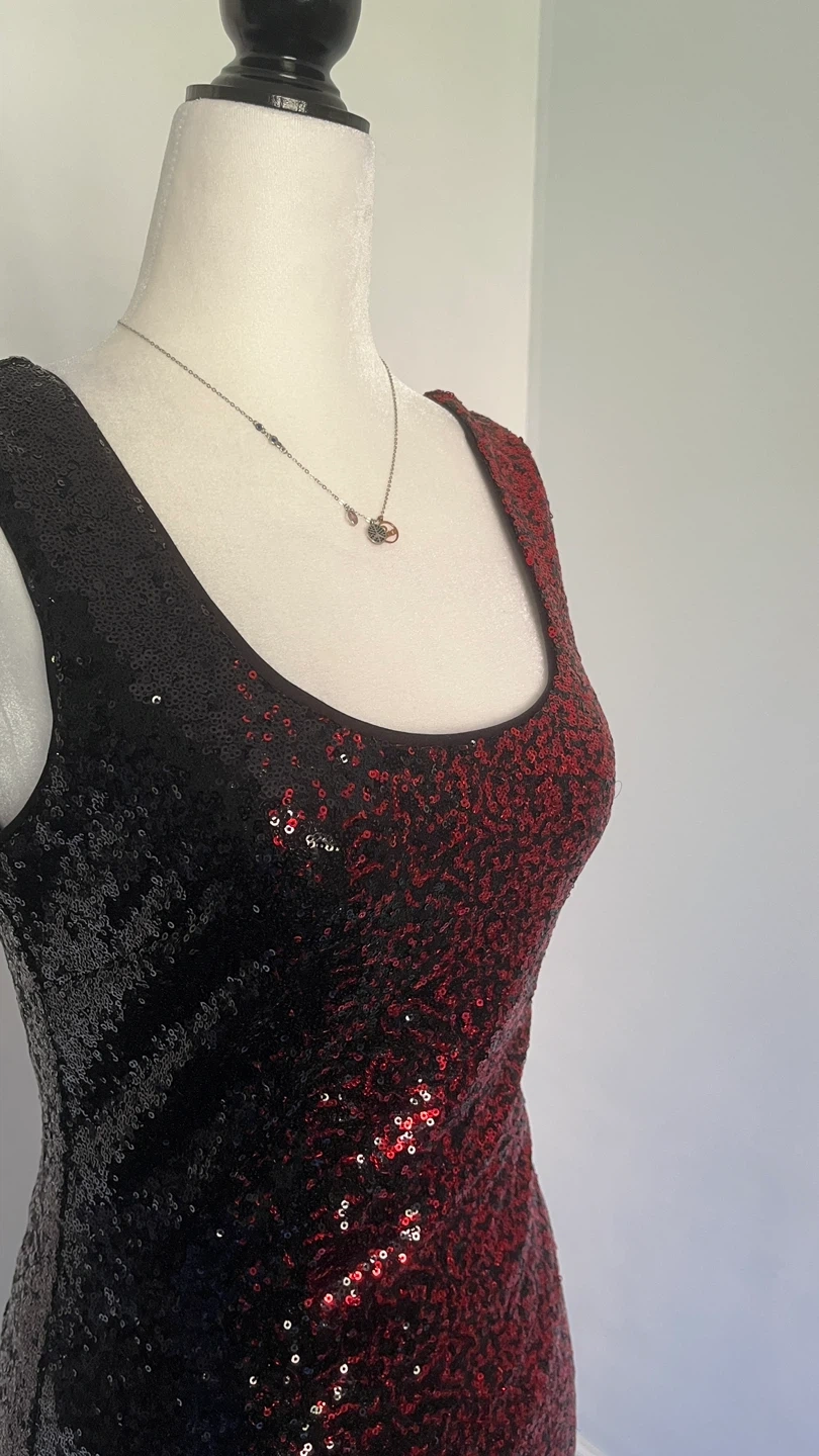 199Selling a cute sleeveless dress with sequins! It's a striking red and black ombre design. Perfect for a night out or a special occasion
