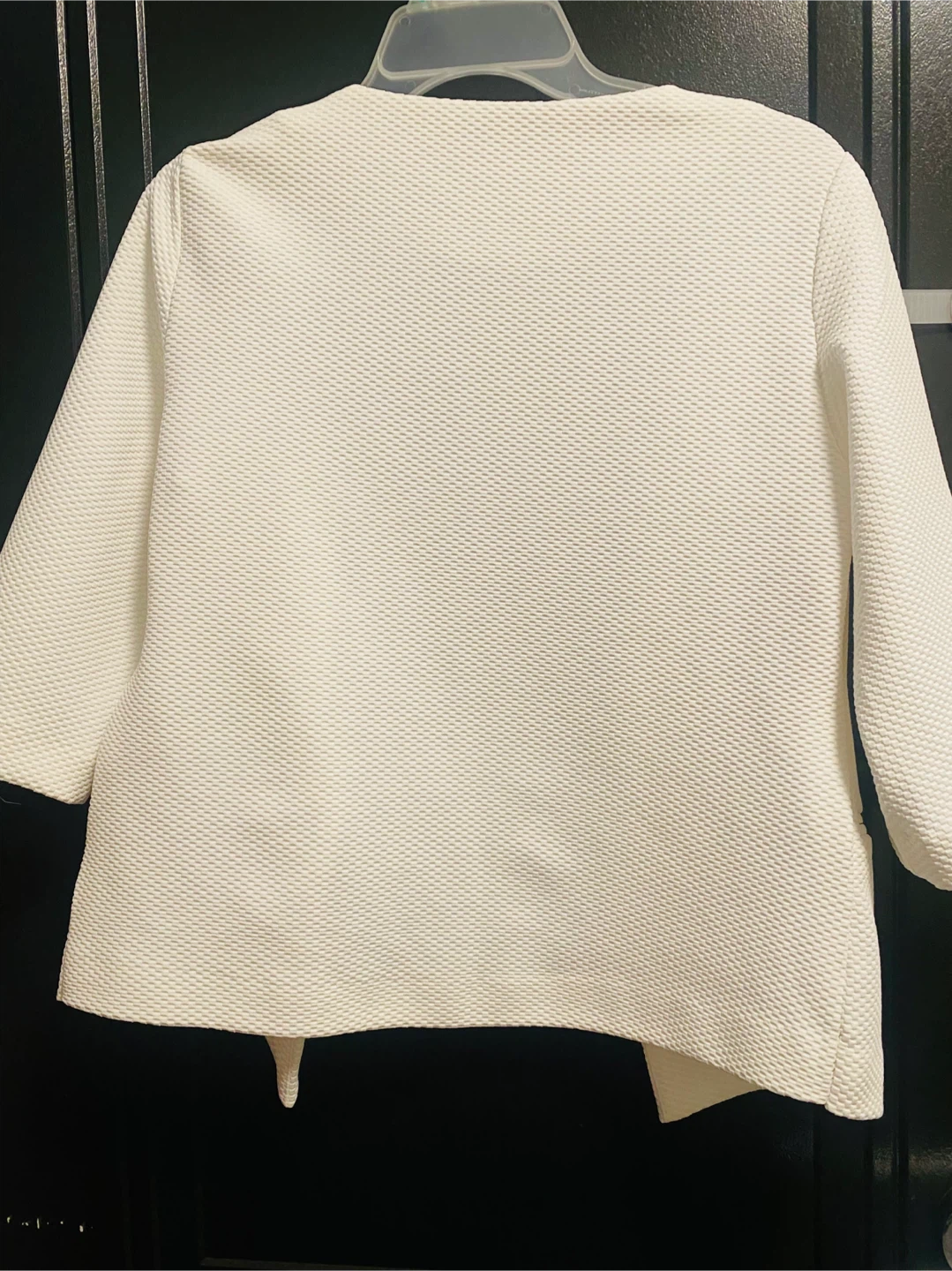 Here's a stylish white blazer with a unique textured fabric! It's a great piece to dress up any outfit. Perfect for layering or wearing on its own.