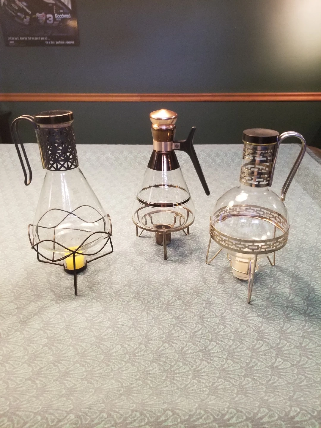 10Selling a set of vintage glass coffee or tea servers, each with its own unique stand. They're in great shape and would make a lovely addition to any collection or a charming way to serve beverages. pick up in Uxbridge