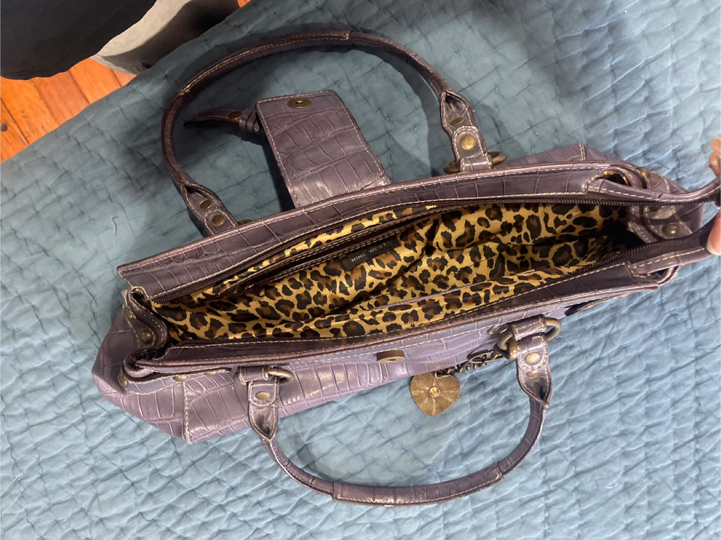 Nine West handbag in a lovely purple colour with a croc-embossed texture! The interior has a fun leopard print lining. It's a stylish and unique bag to add to your collection. Very clean, no damage.