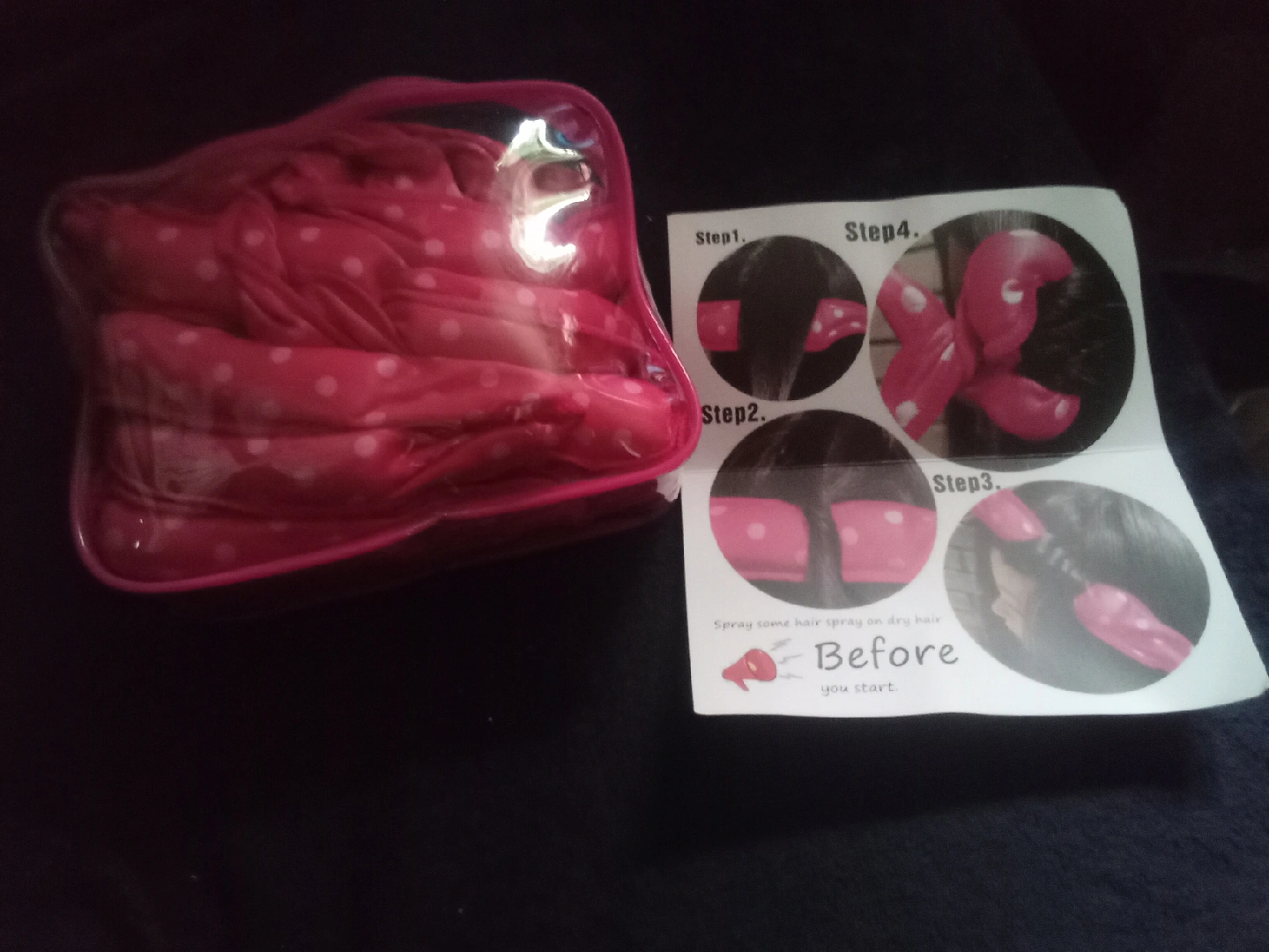 Get beautiful curls with these easy-to-use hair curlers! They come in a cute pink colour with white polka dots and include instructions on how to use them. Spray some hair spray before you start for best results. the zipper on bag is broke.